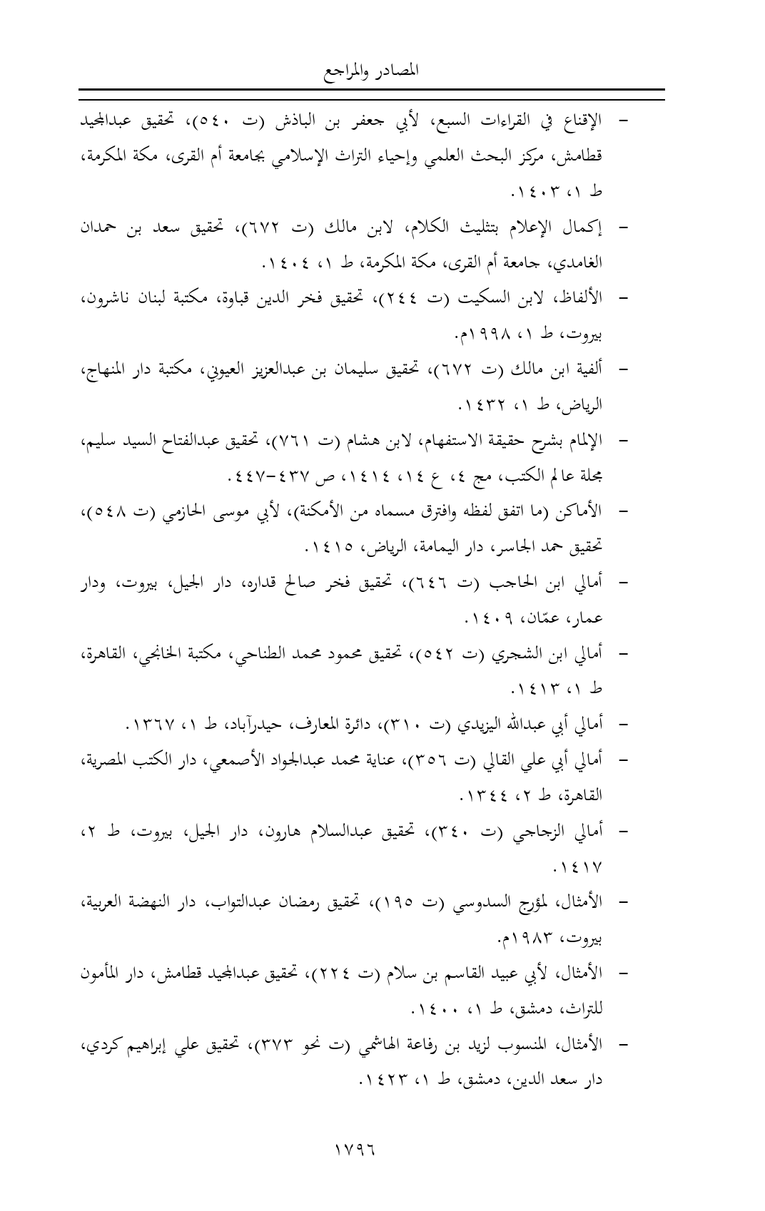 - إكمال الإعلام بتثليث الكلام، لابن مالك (ت ٦٧٢)، تحقيق سعد بن حمدان الغامدي، جامعة أم القرى، مكة المكرمة، ط ١، ١٤٠٤.