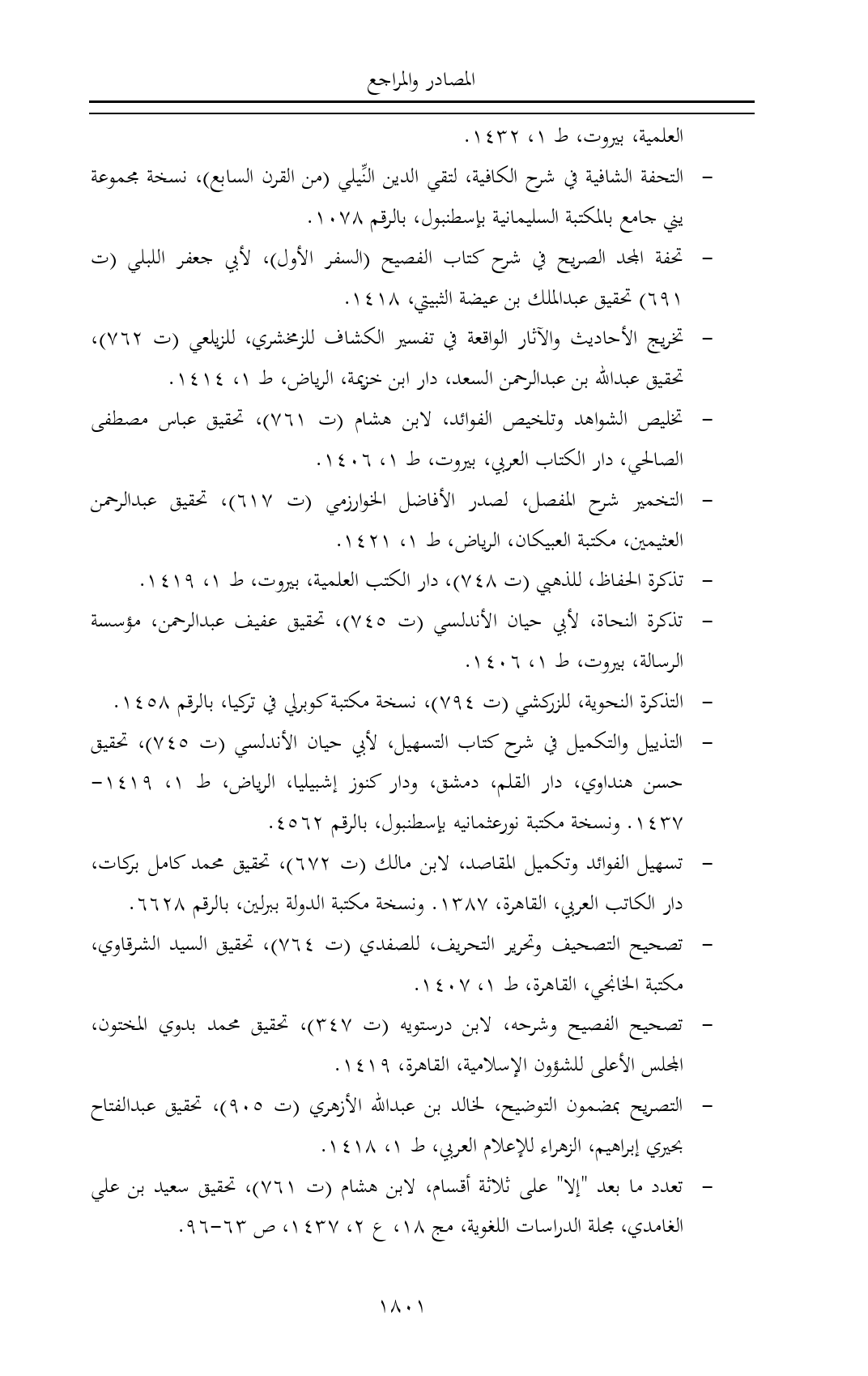 - تعدد ما بعد "إلا" على ثلاثة أقسام، لابن هشام (ت ٧٦١)، تحقيق سعيد بن علي الغامدي، مجلة الدراسات اللغوية، مج ١٨، ع ٢، ١٤٣٧، ص ٦٣ - ٩٦.