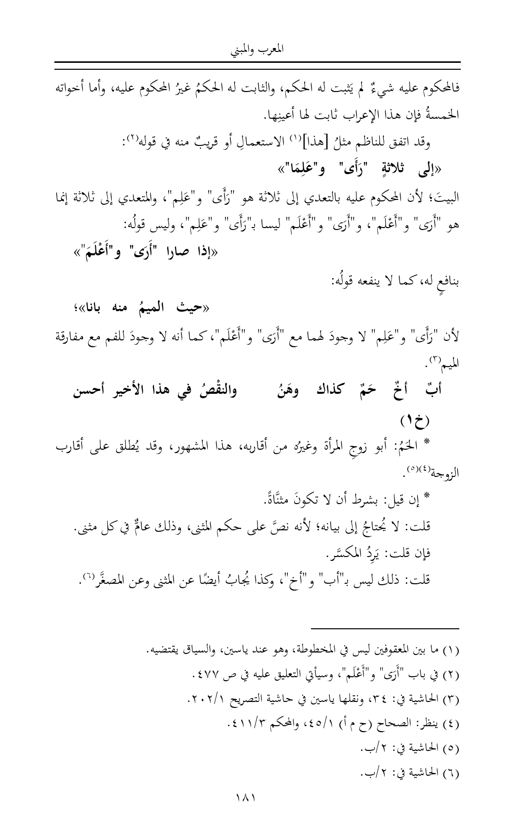 فالمحكوم عليه شيءٌ لم يَثبت له الحكم، والثابت له الحكمُ غيرُ المحكوم عليه، وأما أخواته الخمسةُ فإن هذا الإعراب ثابت لها أعينِها.