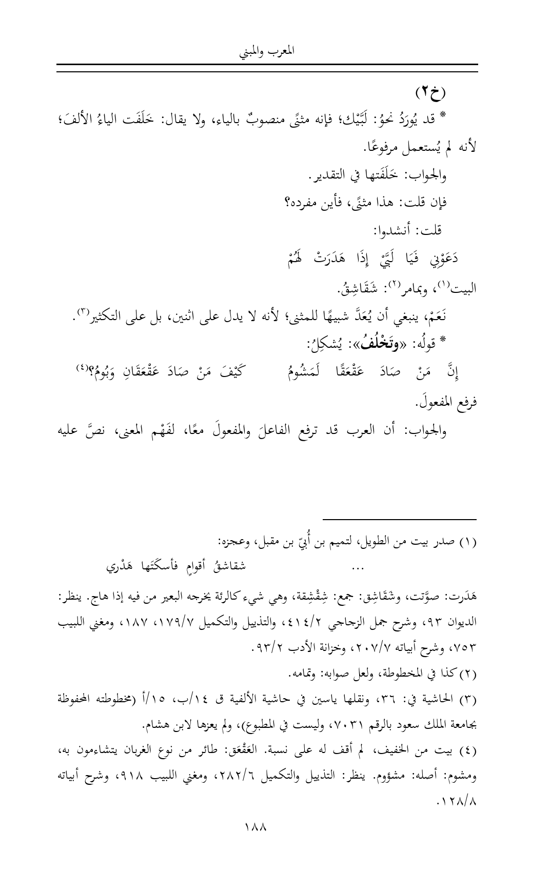 (¬٣) الحاشية في: ٣٦، ونقلها ياسين في حاشية الألفية ق ١٤/ب، ١٥/أ (مخطوطته المحفوظة بجامعة الملك سعود بالرقم ٧٠٣١، وليست في المطبوع)، ولم يعزها لابن هشام.