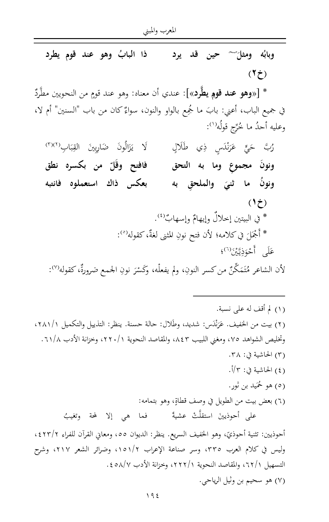 وبابُه ومثلَ حين قد يرد ... ذا البابُ وهو عند قوم يطرد