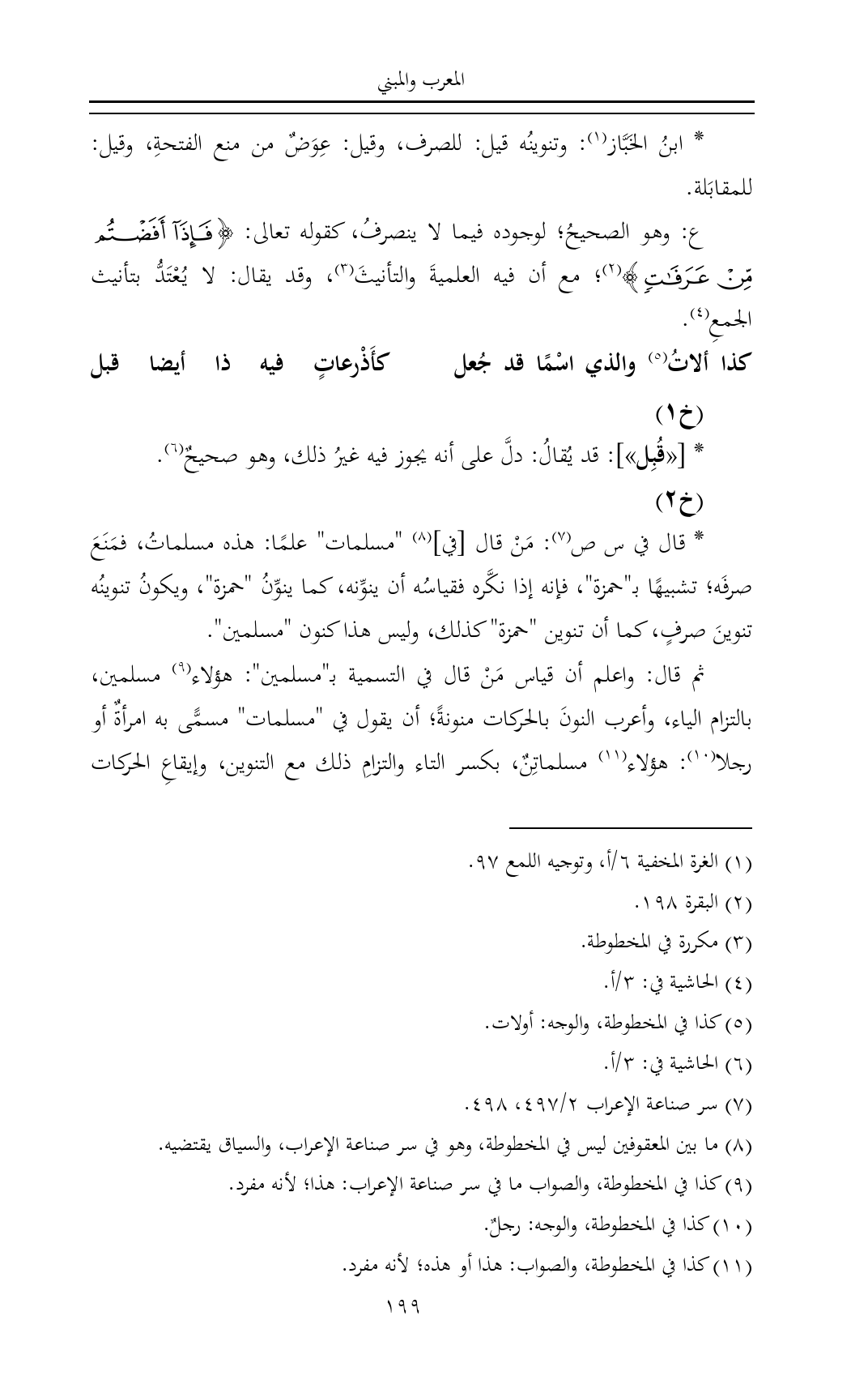 (¬٩) كذا في المخطوطة، والصواب ما في سر صناعة الإعراب: هذا؛ لأنه مفرد.