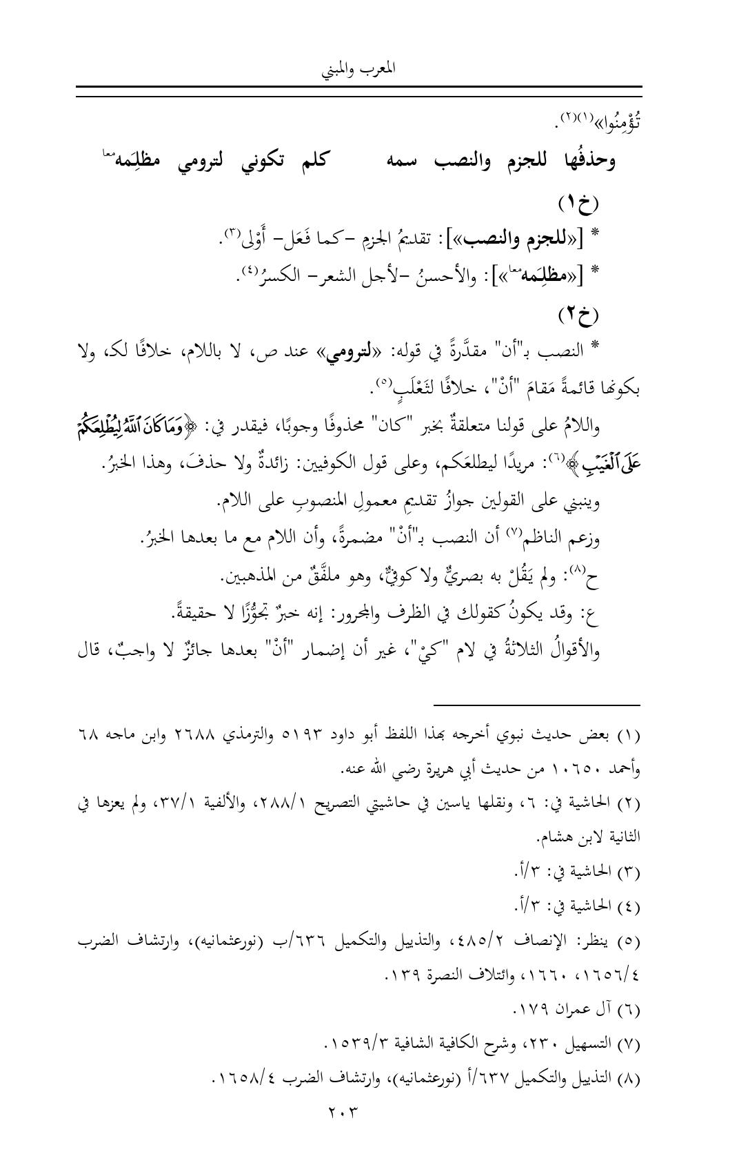 (¬٧) التسهيل ٢٣٠، وشرح الكافية الشافية ٣/ ١٥٣٩.