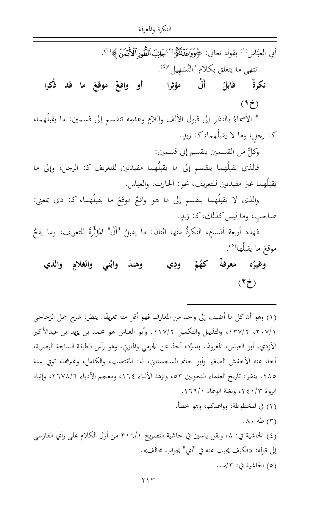(¬١) وهو أن كل ما أضيف إلى واحد من المعارف فهو أقل منه تعريفًا. ينظر: شرح جمل الزجاجي ١/ ٢٠٧، ٢/ ١٣٧، والتذييل والتكميل ٢/ ١١٧. وأبو العباس هو محمد بن يزيد بن عبدالأكبر الأزدي، أبو العباس، المعروف بالمبرِّد، أخذ عن الجرمي والمازني، وهو رأس الطبقة السابعة البصرية، أخذ عنه الأخفش الصغير وأبو حاتم السجستاني، له: المقتضب، والكامل، وغيرهما، توفي سنة ٢٨٥. ينظر: تاريخ العلماء النحويين ٥٣، ونزهة الألباء ١٦٤، ومعجم الأدباء ٦/ ٢٦٧٨، وإنباه الرواة ٣/ ٢٤١، وبغية الوعاة ١/ ٢٦٩.