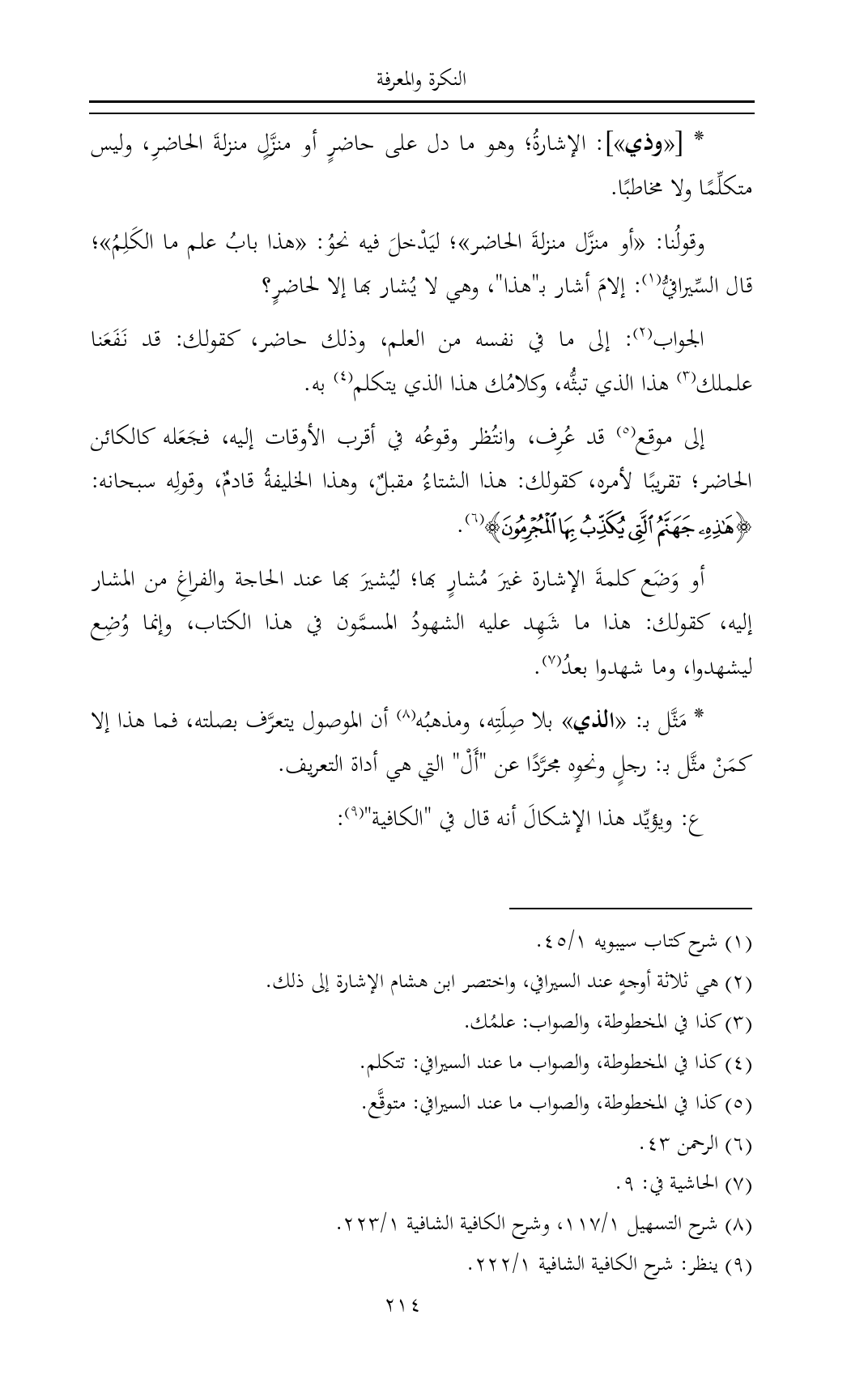 وقولُنا: «أو منزَّل منزلةَ الحاضر»؛ ليَدْخلَ فيه نحوُ: «هذا بابُ علم ما الكَلِمُ»؛ قال السِّيرافيُّ (¬١): إلامَ أشار بـ"هذا"، وهي لا يُشار بها إلا لحاضرٍ؟