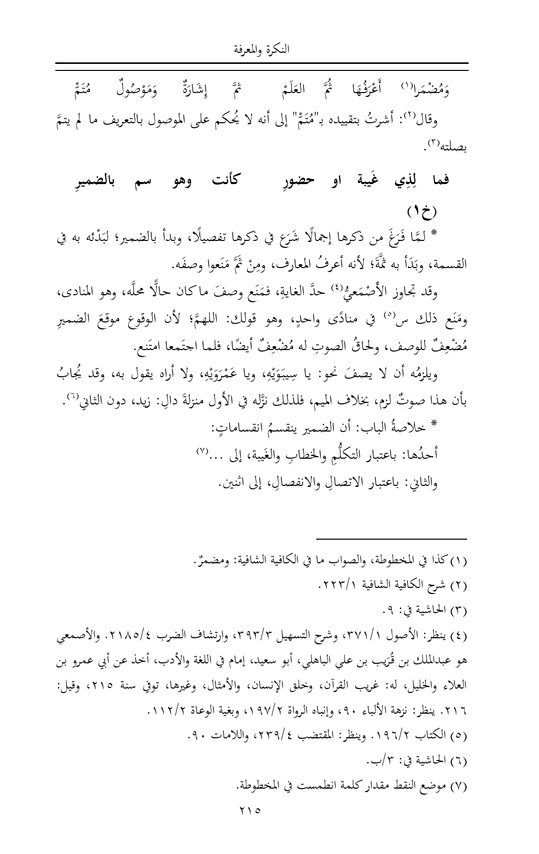 (¬٤) ينظر: الأصول ١/ ٣٧١، وشرح التسهيل ٣/ ٣٩٣، وارتشاف الضرب ٤/ ٢١٨٥. والأصمعي هو عبدالملك بن قُرَيب بن علي الباهلي، أبو سعيد، إمام في اللغة والأدب، أخذ عن أبي عمرو بن العلاء والخليل، له: غريب القرآن، وخلق الإنسان، والأمثال، وغيرها، توفي سنة ٢١٥، وقيل: ٢١٦. ينظر: نزهة الألباء ٩٠، وإنباه الرواة ٢/ ١٩٧، وبغية الوعاة ٢/ ١١٢.