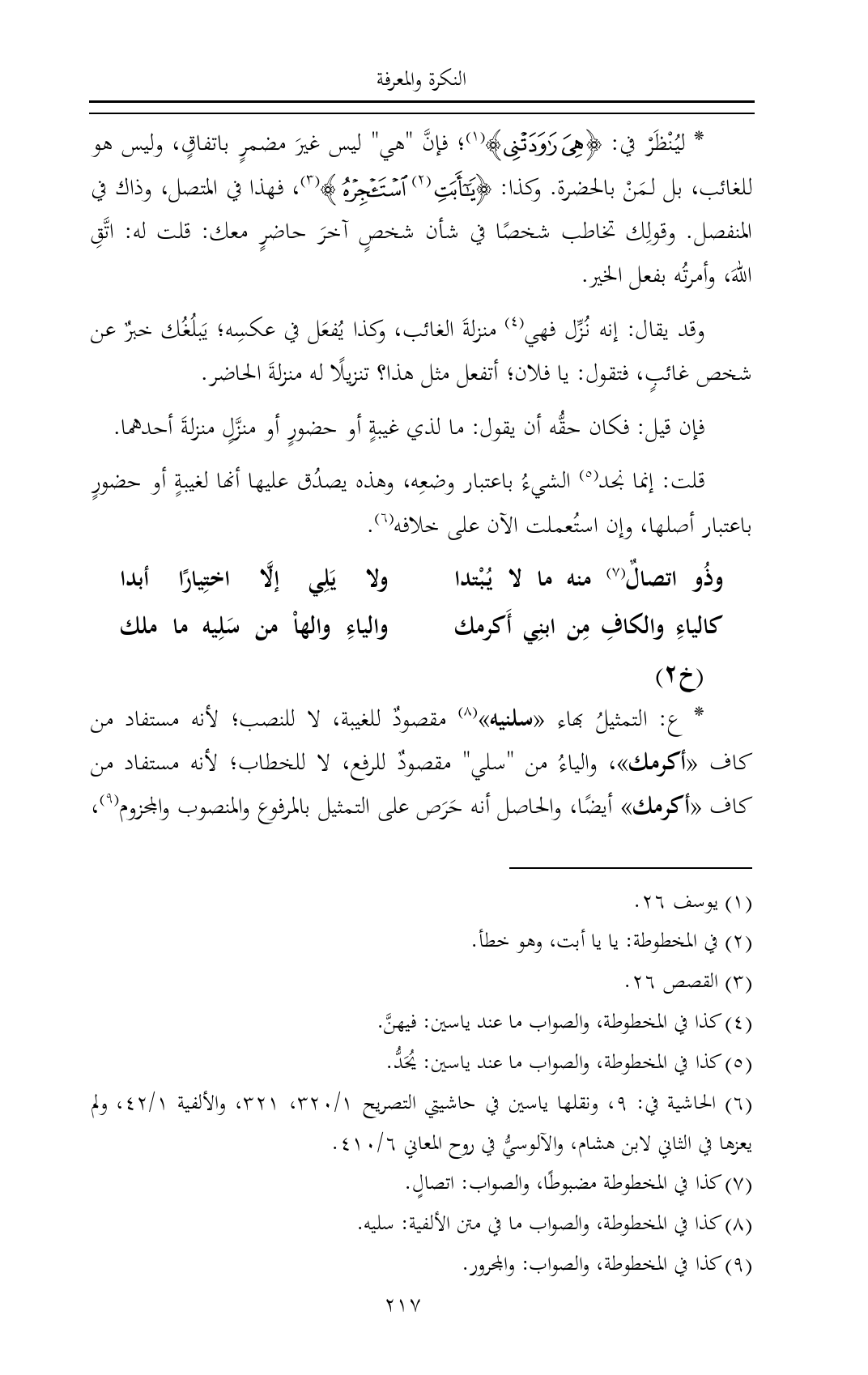 * ع: التمثيلُ بهاء «سلنيه» (¬٨) مقصودٌ للغيبة، لا للنصب؛ لأنه مستفاد من كاف «أكرمك»، والياءُ من "سلي" مقصودٌ للرفع، لا للخطاب؛ لأنه مستفاد من كاف «أكرمك» أيضًا، والحاصل أنه حَرَص على التمثيل بالمرفوع والمنصوب والمجزوم (¬٩)،