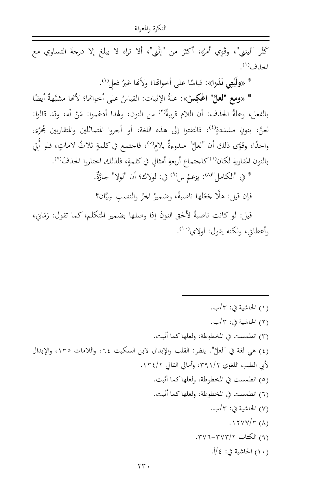 * «ومع "لعلَّ" اعْكِسْ»: علةُ الإثبات: القياسُ على أخواتها؛ لأنها مشبَّهةٌ أيضًا بالفعل، وعلةُ الحذف: أن اللام قريبةٌ (¬٣) من النون، ولهذا أدغموا: مَنْ لّه، وقد قالوا: لعنَّ، بنونٍ مشددةٍ (¬٤)، فالتفتوا إلى هذه اللغة، أو أجروا المتماثلين والمتقاربين مُجرًى واحدًا، وقوَّى ذلك أن "لعلَّ" مبدوءةٌ بلامٍ (¬٥)، فاجتمع في كلمةٍ ثلاثُ لاماتٍ، فلو أُتِي بالنون المقاربةِ لكان (¬٦) كاجتماع أربعةِ أمثالٍ في كلمةٍ، فلذلك اختاروا الحذفَ (¬٧).