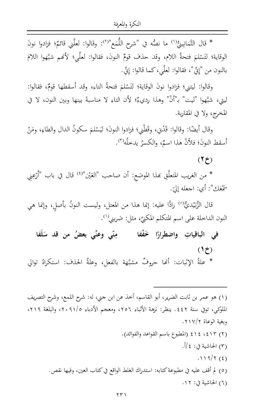 * قال الثَّمَانِينيُّ (¬١) ما نصُّه في "شرح اللُّمَع" (¬٢): وقالوا: لعلَّني قائمٌ؛ فزادوا نونَ الوقاية؛ لتَسْلمَ فتحةُ اللام، وقد حذف قومٌ النونَ، فقالوا: لعلِّي؛ لأنهم شبَّهوا اللامَ بالنون من "إِنِّي"، فقالوا: لعلِّي، كما قالوا: إِنِّي.