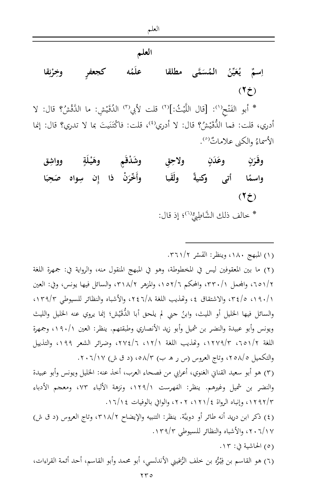 (¬٢) ما بين المعقوفين ليس في المخطوطة، وهو في المبهج المنقول منه، والرواية في: جمهرة اللغة ٢/ ٦٥١، والمجمل ١/ ٣٣٠، والمحكم ٦/ ١٥٢، والمزهر ٢/ ٣١٨، والسائل فيها يونس، وفي: العين ١/ ١٩٠، ٥/ ٣٤، والاشتقاق ٤، وتهذيب اللغة ٨/ ٢٤٦، والأشباه والنظائر للسيوطي ٣/ ١٣٩، والسائل فيها الخليل أو الليث، وابنُ جني لم يلحق أبا الدُّقَيْش؛ إنما يروي عنه الخليل والليث ويونس وأبو عبيدة والنضر بن شميل وأبو زيد الأنصاري وطبقتهم. ينظر: العين ١/ ١٩٠، وجمهرة اللغة ٢/ ٦٥١، ٣/ ١٢٧٩، وتهذيب اللغة ١/ ١٢، ٦/ ٢٧٤، وضرائر الشعر ١٩٩، والتذييل والتكميل ٥/ ٢٥٨، وتاج العروس (س ر هـ ب) ٣/ ٥٨، (د ق ش) ١٧/ ٢٠٦.