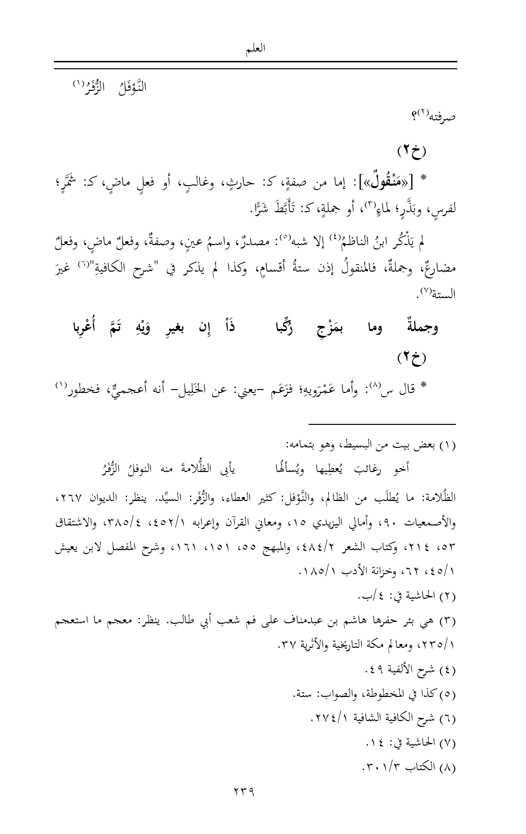 الظُلامة: ما يُطلَب من الظالم، والنَّوْفل: كثير العطاء، والزُّفَر: السيِّد. ينظر: الديوان ٢٦٧، والأصمعيات ٩٠، وأمالي اليزيدي ١٥، ومعاني القرآن وإعرابه ١/ ٤٥٢، ٤/ ٣٨٥، والاشتقاق ٥٣، ٢١٤، وكتاب الشعر ٢/ ٤٨٤، والمبهج ٥٥، ١٥١، ١٦١، وشرح المفصل لابن يعيش ١/ ٤٥، ٦٢، وخزانة الأدب ١/ ١٨٥.