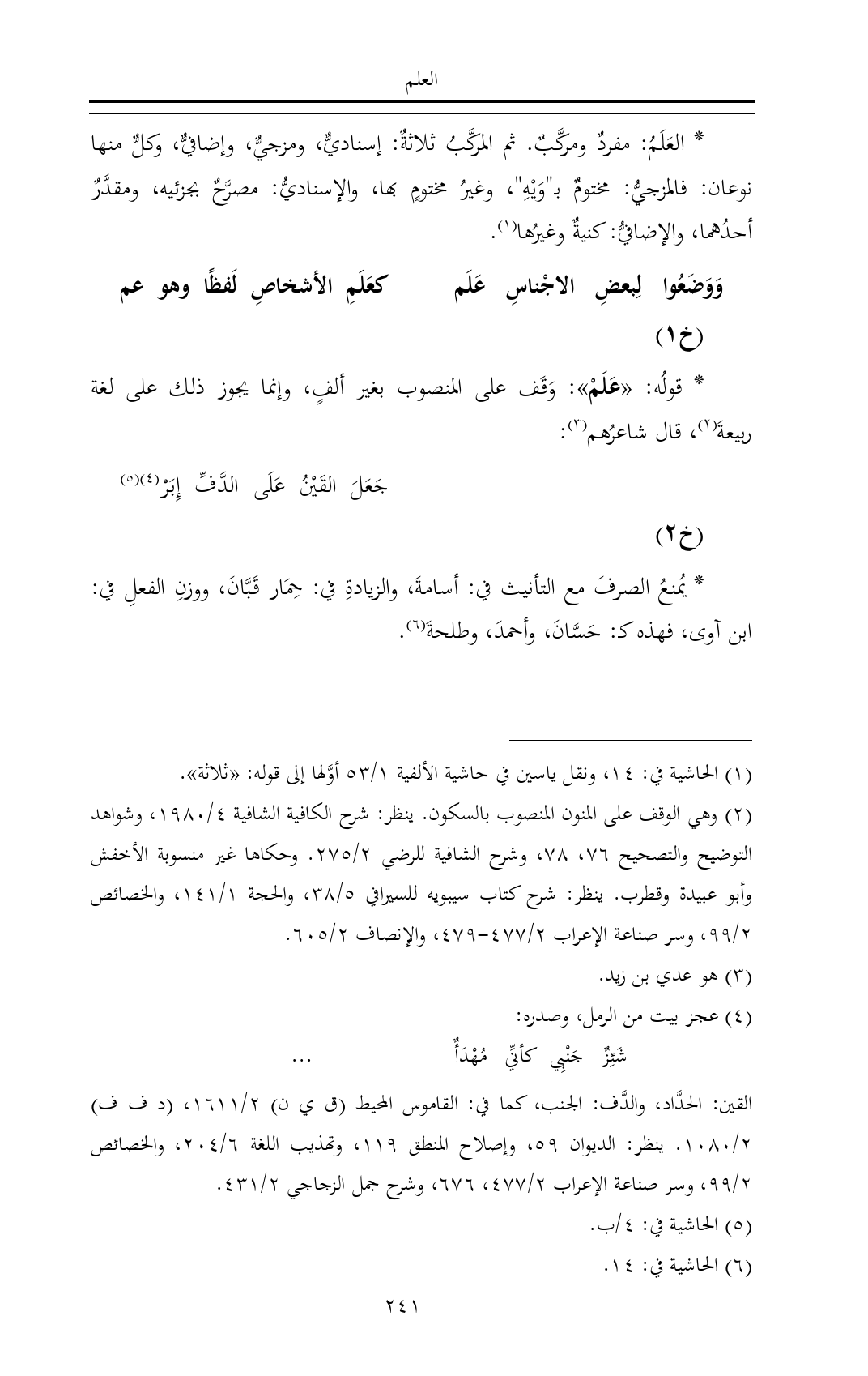* العَلَمُ: مفردٌ ومركَّبٌ. ثم المركَّبُ ثلاثةٌ: إسناديٌّ، ومزجيٌّ، وإضافيٌّ، وكلٌّ منها نوعان: فالمزجيُّ: مختومٌ بـ"وَيْهِ"، وغيرُ مختومٍ بها، والإسناديُّ: مصرَّحٌ بجزئيه، ومقدَّرٌ أحدُهما، والإضافيُّ: كنيةٌ وغيرُها (¬١).