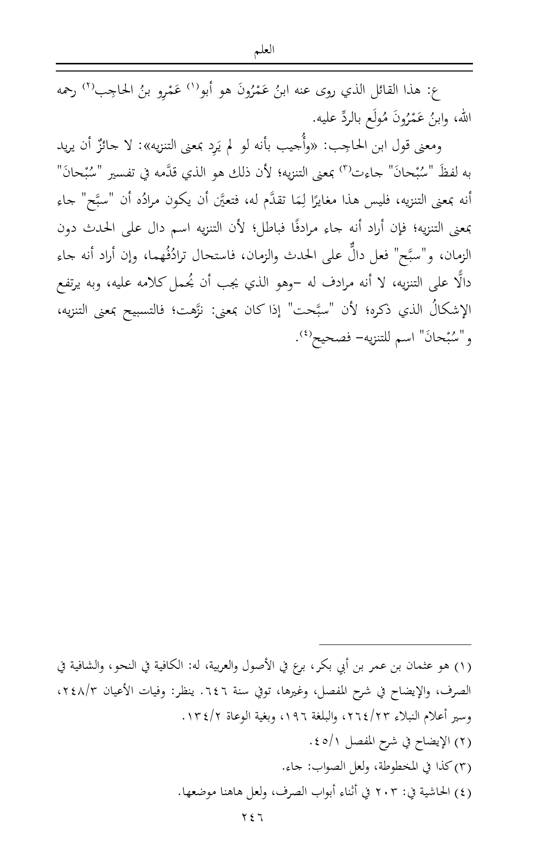 (¬١) هو عثمان بن عمر بن أبي بكر، برع في الأصول والعربية، له: الكافية في النحو، والشافية في الصرف، والإيضاح في شرح المفصل، وغيرها، توفي سنة ٦٤٦. ينظر: وفيات الأعيان ٣/ ٢٤٨، وسير أعلام النبلاء ٢٣/ ٢٦٤، والبلغة ١٩٦، وبغية الوعاة ٢/ ١٣٤.