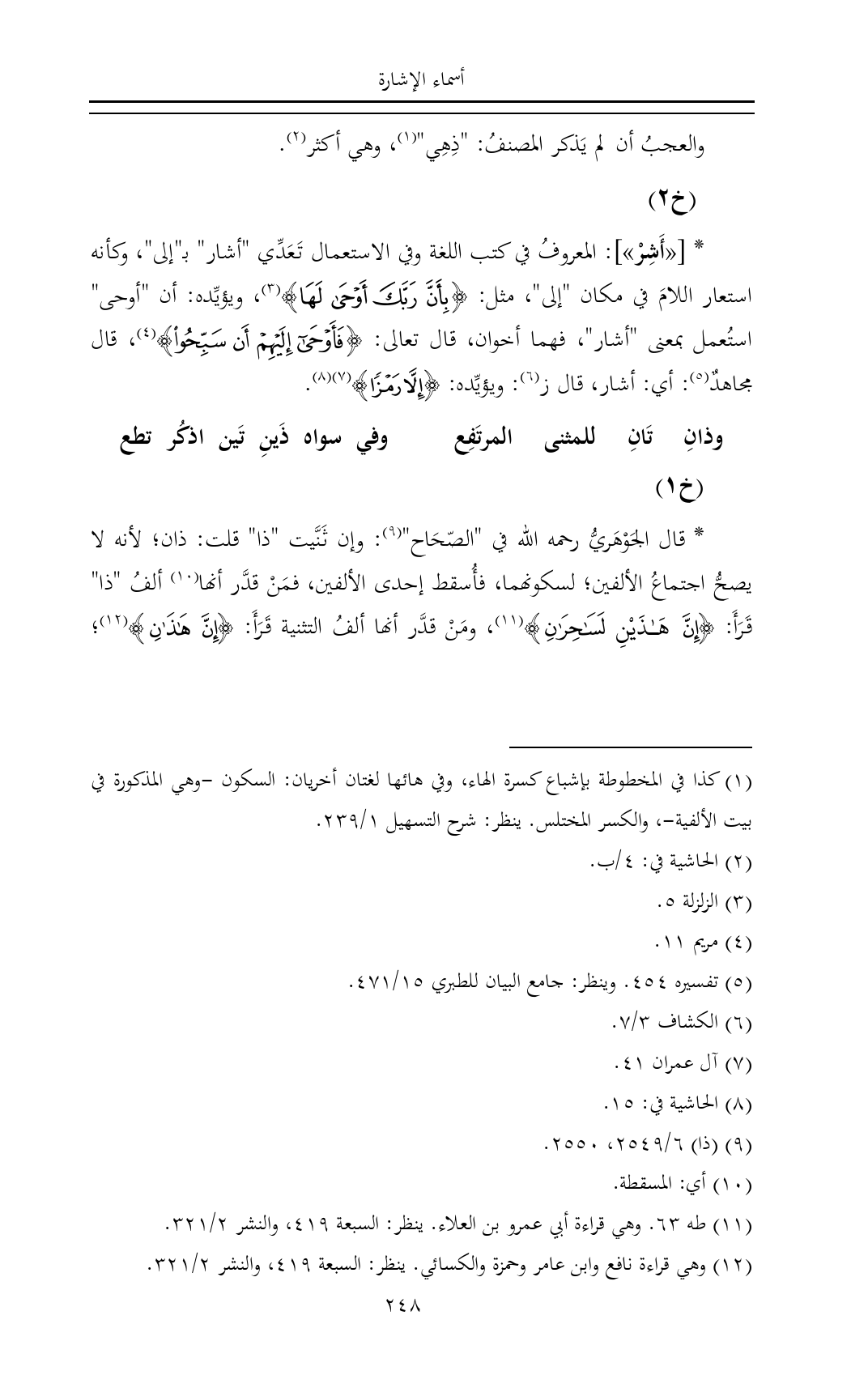 * قال الجَوْهَريُّ رحمه الله في "الصّحَاح" (¬٩): وإن ثَنَّيت "ذا" قلت: ذان؛ لأنه لا يصحُّ اجتماعُ الألفين؛ لسكونهما، فأُسقط إحدى الألفين، فمَنْ قدَّر أنها (¬١٠) ألفُ "ذا" قَرَأَ: {إِنَّ هَاذَيْنِ لَسَاحِرَانِ} (¬١١)، ومَنْ قدَّر أنها ألفُ التثنية قَرَأَ: {إِنَّ هَذَانِ} (¬١٢)؛