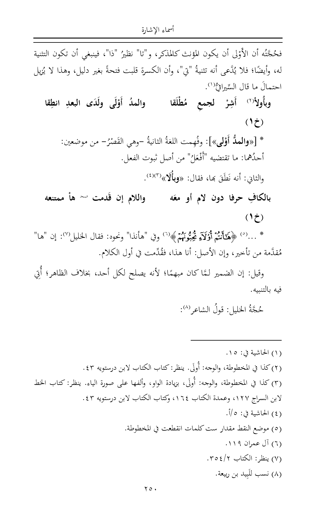 * ... (¬٥) {هَاأَنْتُمْ أُولَاءِ تُحِبُّونَهُمْ} (¬٦) وفي "هأنذا" ونحوه: فقال الخليل (¬٧): إن "ها" مُقدَّمة من تأخير، وإن الأصل: أنا هذا، فقُدِّمت في أول الكلام.