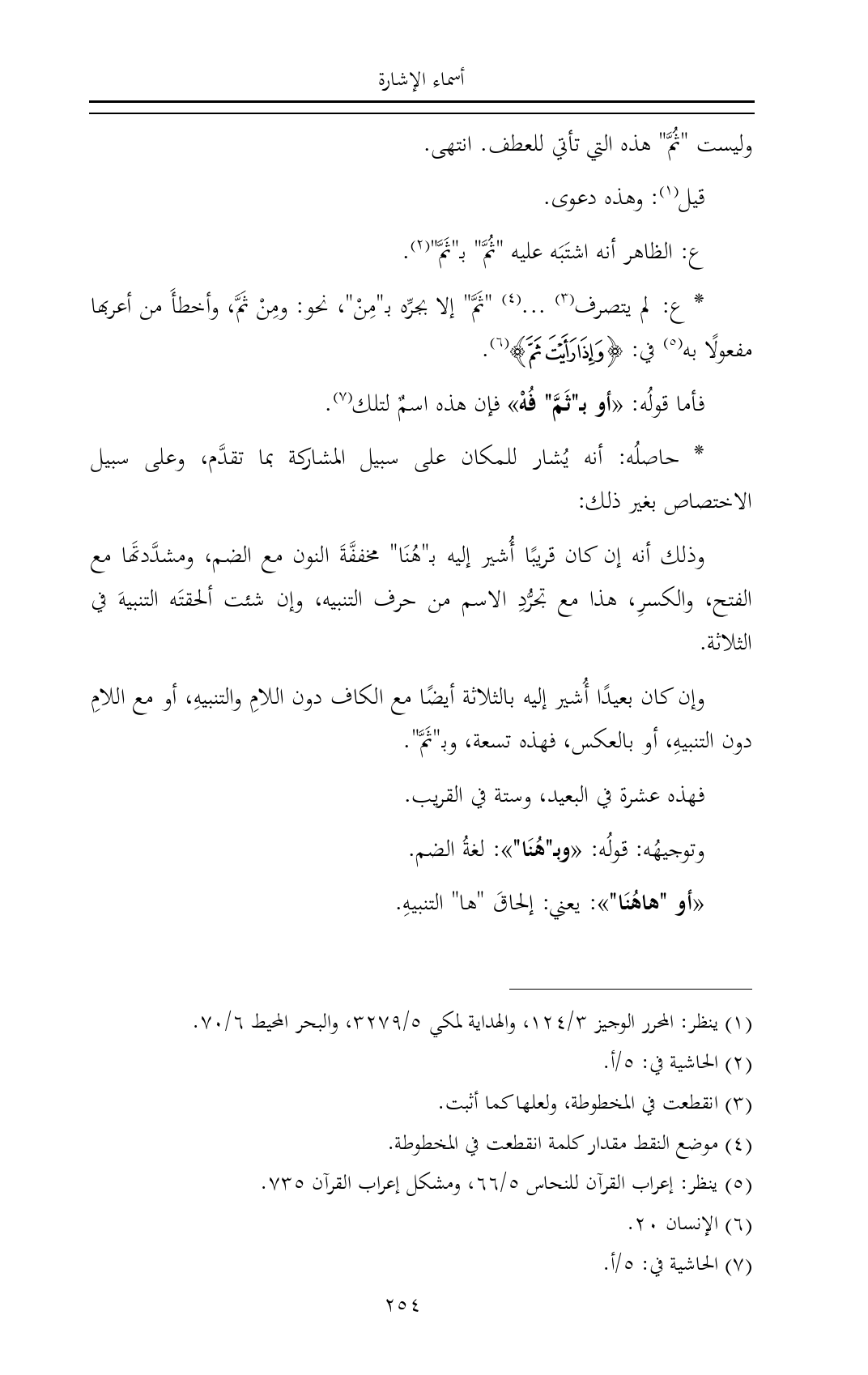 * ع: لم يتصرف (¬٣) ... (¬٤) "ثَمَّ" إلا بجرِّه بـ"مِنْ"، نحو: ومِنْ ثَمَّ، وأخطأَ من أعربها مفعولًا به (¬٥) في: {وَإِذَا رَأَيْتَ ثَمَّ} (¬٦).