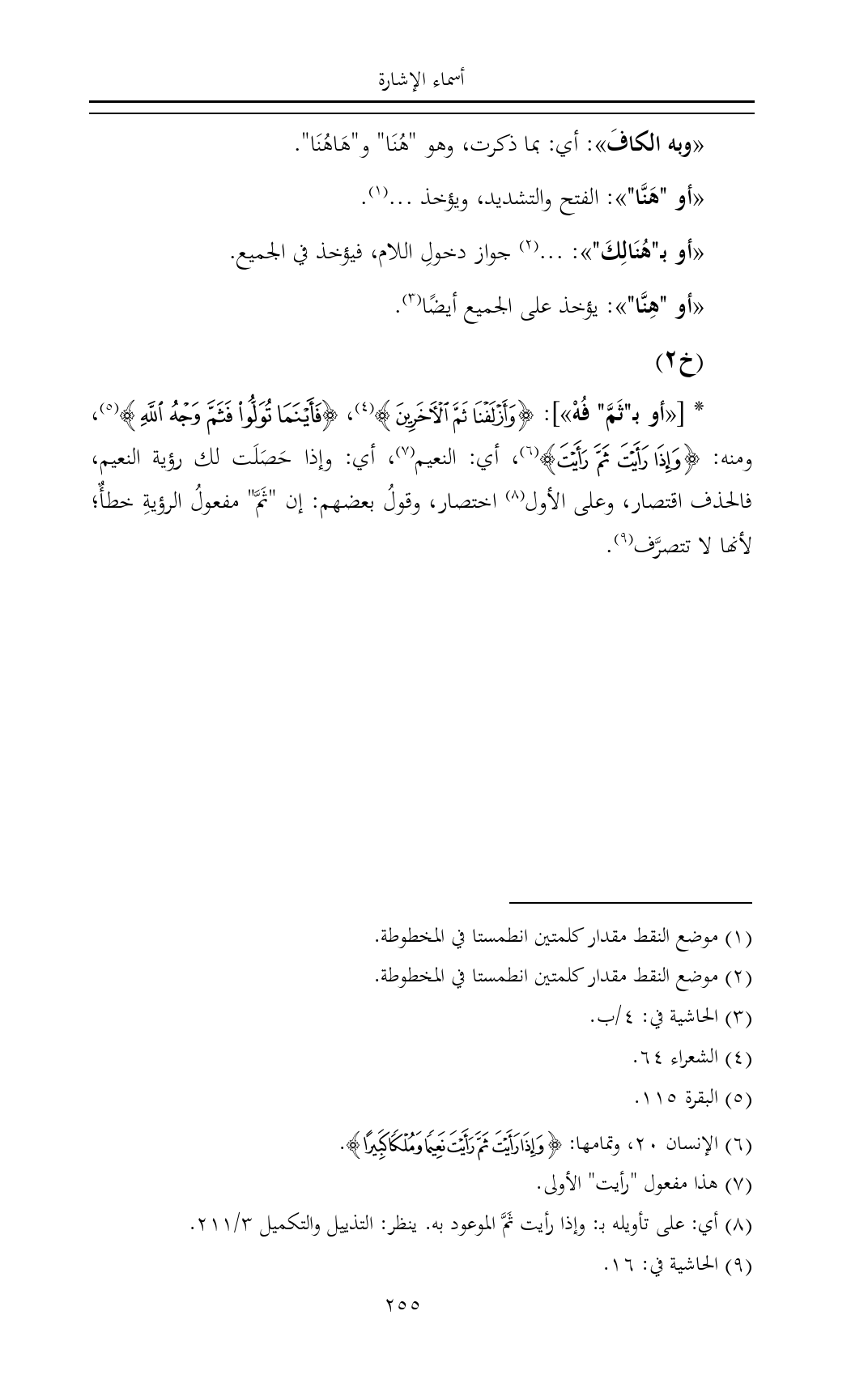 * [«أو بـ"ثَمَّ" فُهْ»]: {وَأَزْلَفْنَا ثَمَّ الْآخَرِينَ} (¬٤)، {فَأَيْنَمَا تُوَلُّوا فَثَمَّ وَجْهُ اللَّهِ} (¬٥)، ومنه: {وَإِذَا رَأَيْتَ ثَمَّ رَأَيْتَ} (¬٦)، أي: النعيم (¬٧)، أي: وإذا حَصَلَت لك رؤية النعيم، فالحذف اقتصار، وعلى الأول (¬٨) اختصار، وقولُ بعضهم: إن "ثَمَّ" مفعولُ الرؤيةِ خطأٌ؛ لأنها لا تتصرَّف (¬٩).