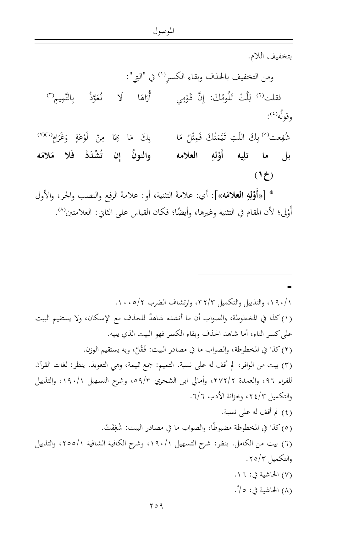 (¬١) كذا في المخطوطة، والصواب أن ما أنشده شاهدٌ للحذف مع الإسكان، ولا يستقيم البيت على كسر التاء، أما شاهد الحذف وبقاء الكسر فهو البيت الذي يليه.