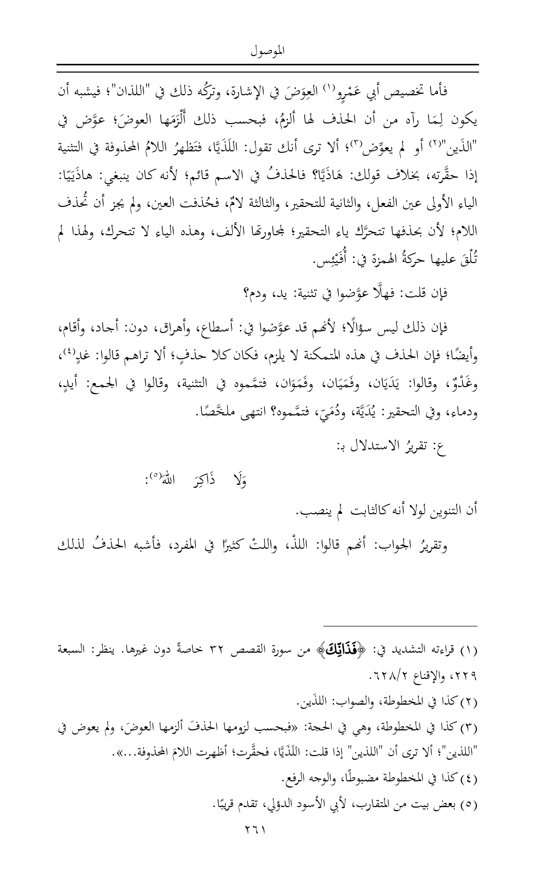 (¬٣) كذا في المخطوطة، وهي في الحجة: «فبحسب لزومها الحذفَ ألزمها العوضَ، ولم يعوض في "اللذين"؛ ألا ترى أن "اللذين" إذا قلت: اللَذَيَّا، فحقَّرت؛ أظهرت اللامَ المحذوفة ... ».