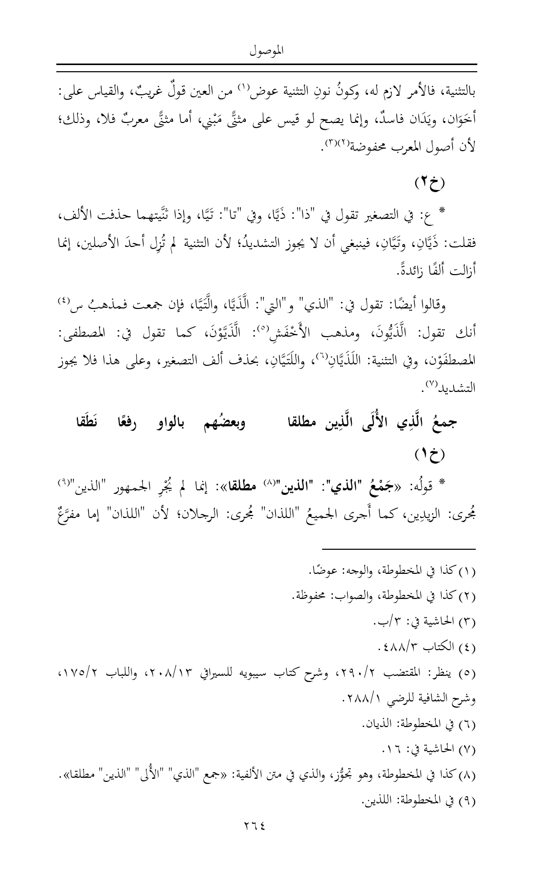 (¬٨) كذا في المخطوطة، وهو تجوُّز، والذي في متن الألفية: «جمع "الذي" "الأُلى" "الذين" مطلقا».