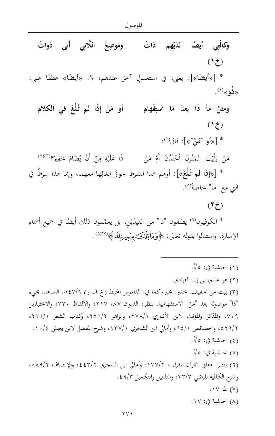 * الكوفيون (¬٦) يطلقون "ذا" من القيدَيْنِ، بل يعمِّمون ذلك أيضًا في جميع أسماء الإشارة، واستدلوا بقوله تعالى: {وَمَا تِلْكَ بِيَمِينِكَ} (¬٧) (¬٨).
