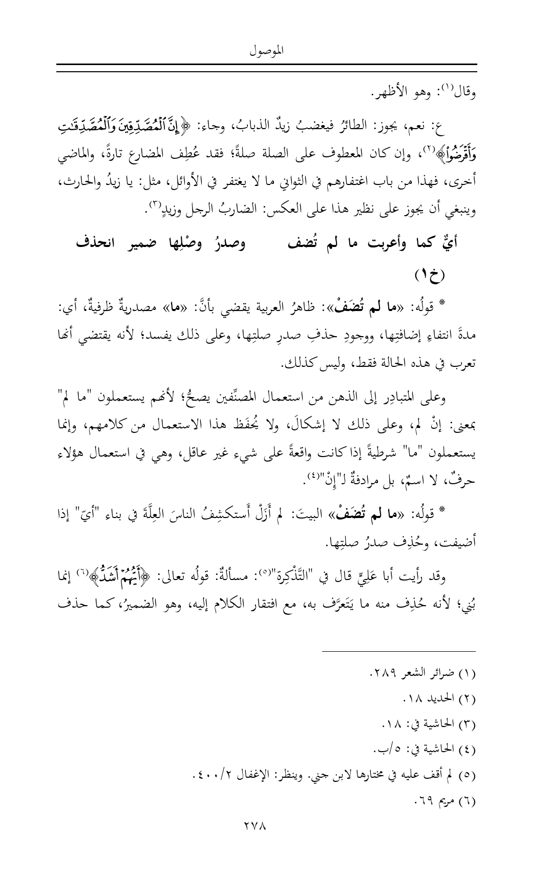 ع: نعم، يجوز: الطائرُ فيغضبُ زيدٌ الذبابُ، وجاء: {إِنَّ الْمُصَّدِّقِينَ وَالْمُصَّدِّقَاتِ وَأَقْرَضُوا} (¬٢)، وإن كان المعطوف على الصلة صلةً؛ فقد عُطِف المضارع تارةً، والماضي أخرى، فهذا من باب اغتفارهم في الثواني ما لا يغتفر في الأوائل، مثل: يا زيدُ والحارث، وينبغي أن يجوز على نظير هذا على العكس: الضاربُ الرجل وزيدٍ (¬٣).