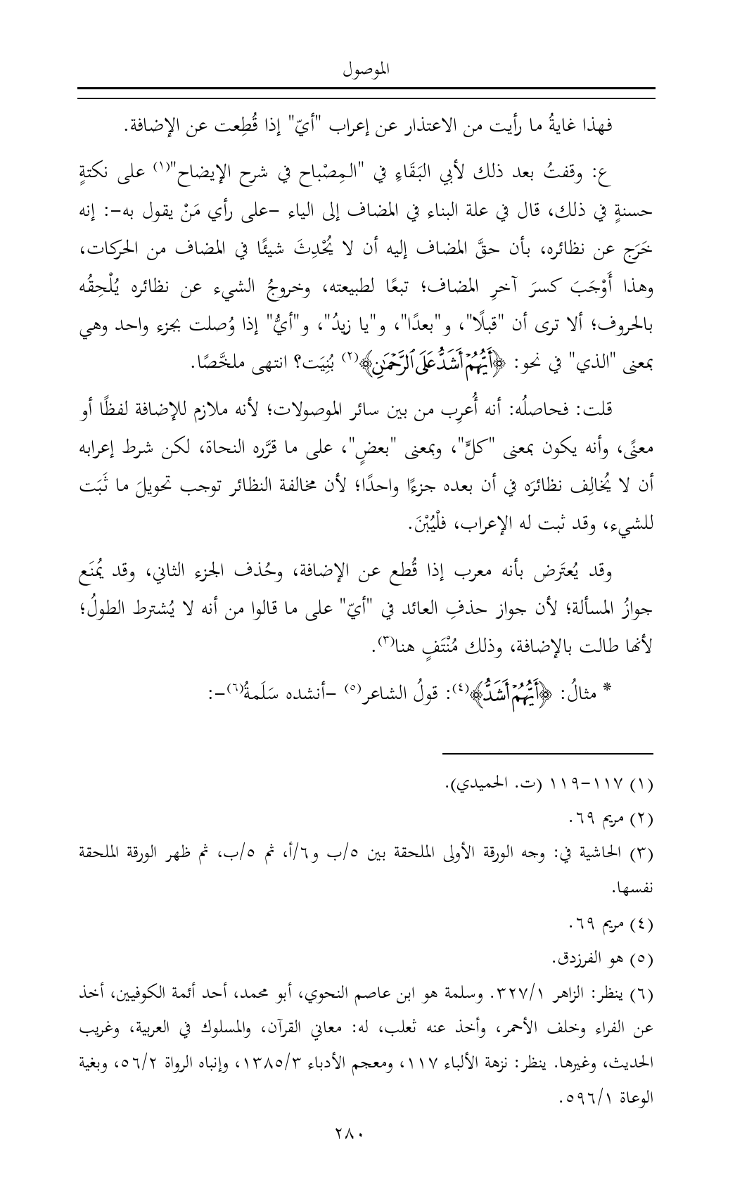 وقد يُعتَرض بأنه معرب إذا قُطع عن الإضافة، وحُذف الجزء الثاني، وقد يُمنَع جوازُ المسألة؛ لأن جواز حذفِ العائد في "أيّ" على ما قالوا من أنه لا يُشترط الطولُ؛ لأنها طالت بالإضافة، وذلك مُنْتَفٍ هنا (¬٣).