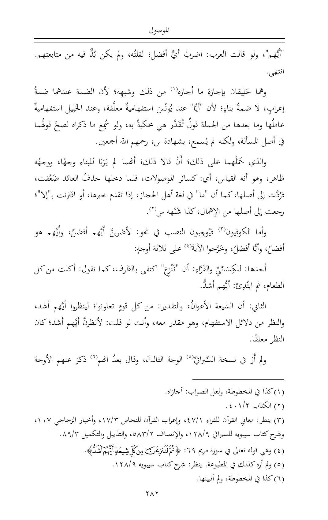 وأما الكوفيون (¬٣) فيُوجِبون النصب في نحو: لأضربنَّ أَيَّهم أفضلُ، وأَيَّهم هو أفضلُ، وأيًّا أفضلُ، وخَرَّجوا الآيةَ (¬٤) على ثلاثة أوجهٍ:
