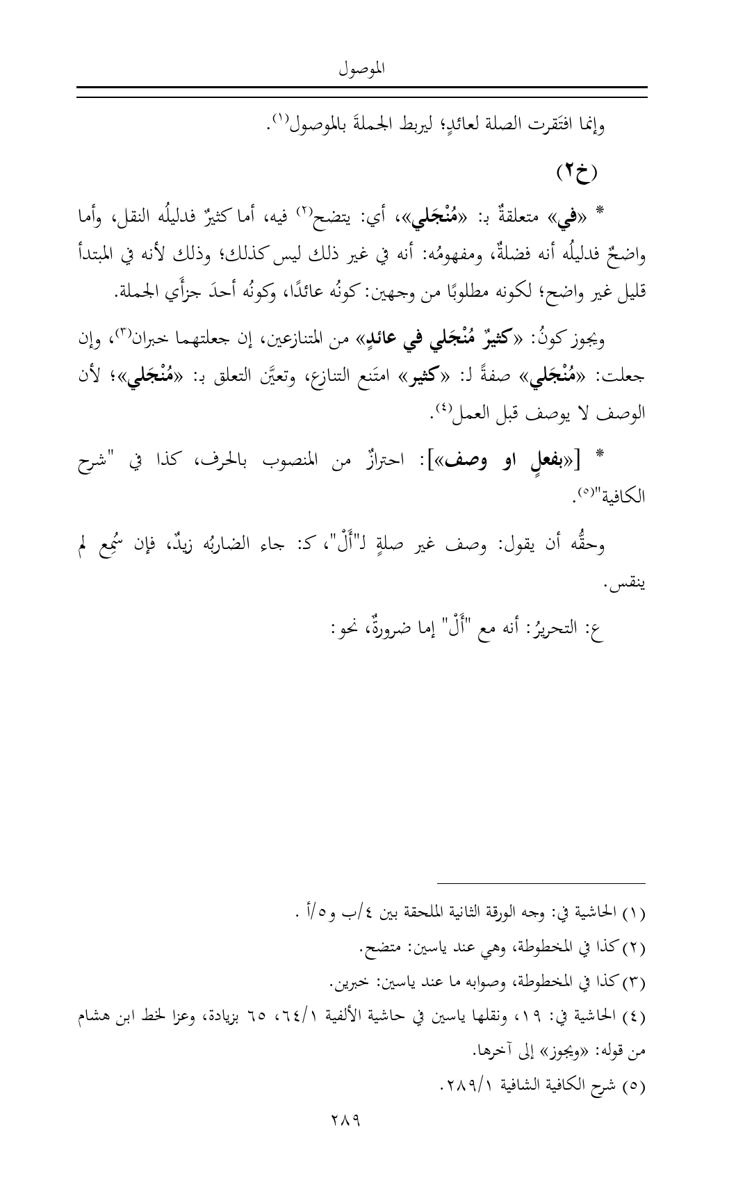 * «في» متعلقةٌ بـ: «مُنْجَلي»، أي: يتضح (¬٢) فيه، أما كثيرٌ فدليلُه النقل، وأما واضحٌ فدليلُه أنه فضلةٌ، ومفهومُه: أنه في غير ذلك ليس كذلك؛ وذلك لأنه في المبتدأ قليل غير واضح؛ لكونه مطلوبًا من وجهين: كونُه عائدًا، وكونُه أحدَ جزأَي الجملة.