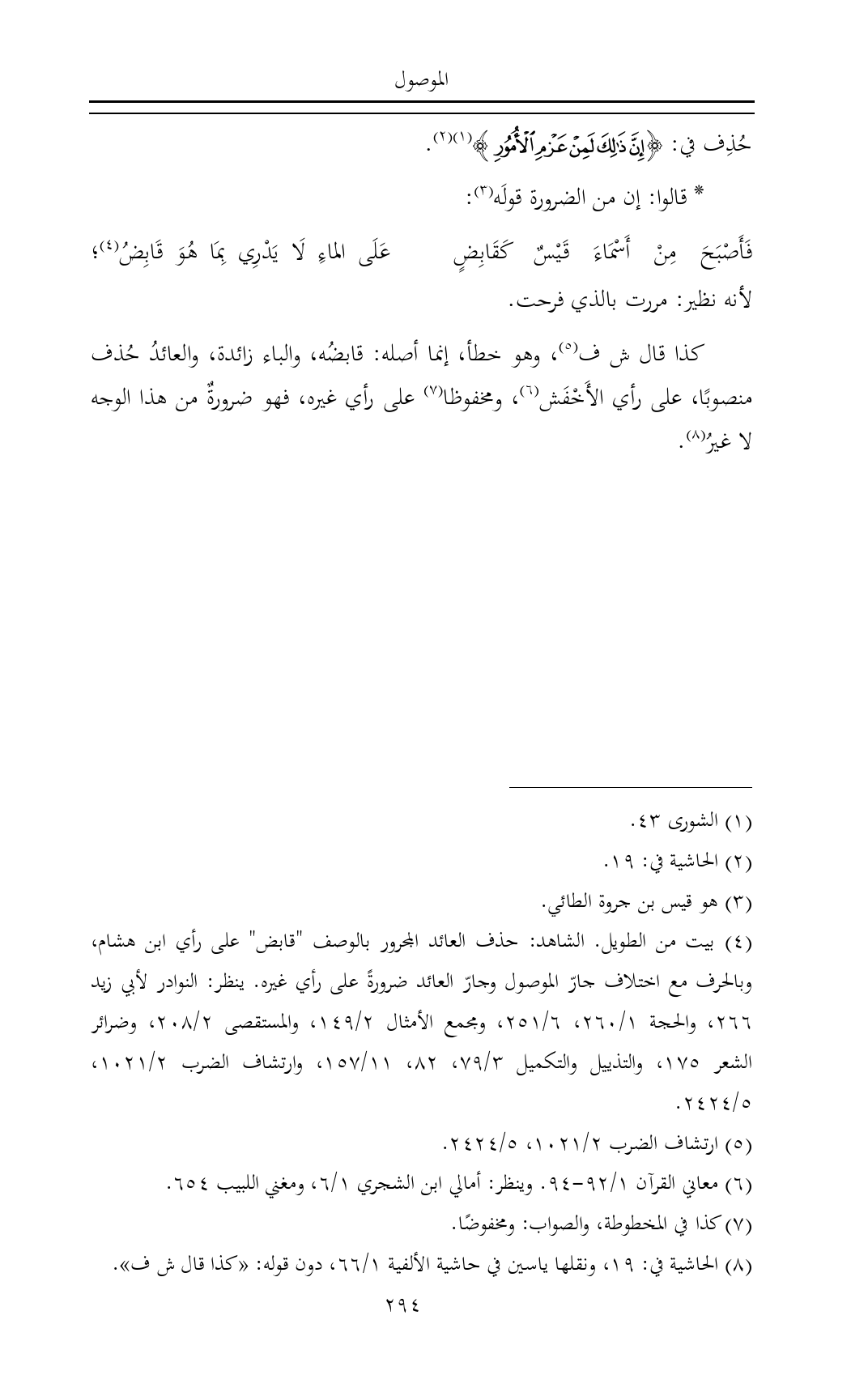 (¬٤) بيت من الطويل. الشاهد: حذف العائد المجرور بالوصف "قابض" على رأي ابن هشام، وبالحرف مع اختلاف جارّ الموصول وجارّ العائد ضرورةً على رأي غيره. ينظر: النوادر لأبي زيد ٢٦٦، والحجة ١/ ٢٦٠، ٦/ ٢٥١، ومجمع الأمثال ٢/ ١٤٩، والمستقصى ٢/ ٢٠٨، وضرائر الشعر ١٧٥، والتذييل والتكميل ٣/ ٧٩، ٨٢، ١١/ ١٥٧، وارتشاف الضرب ٢/ ١٠٢١، ٥/ ٢٤٢٤.