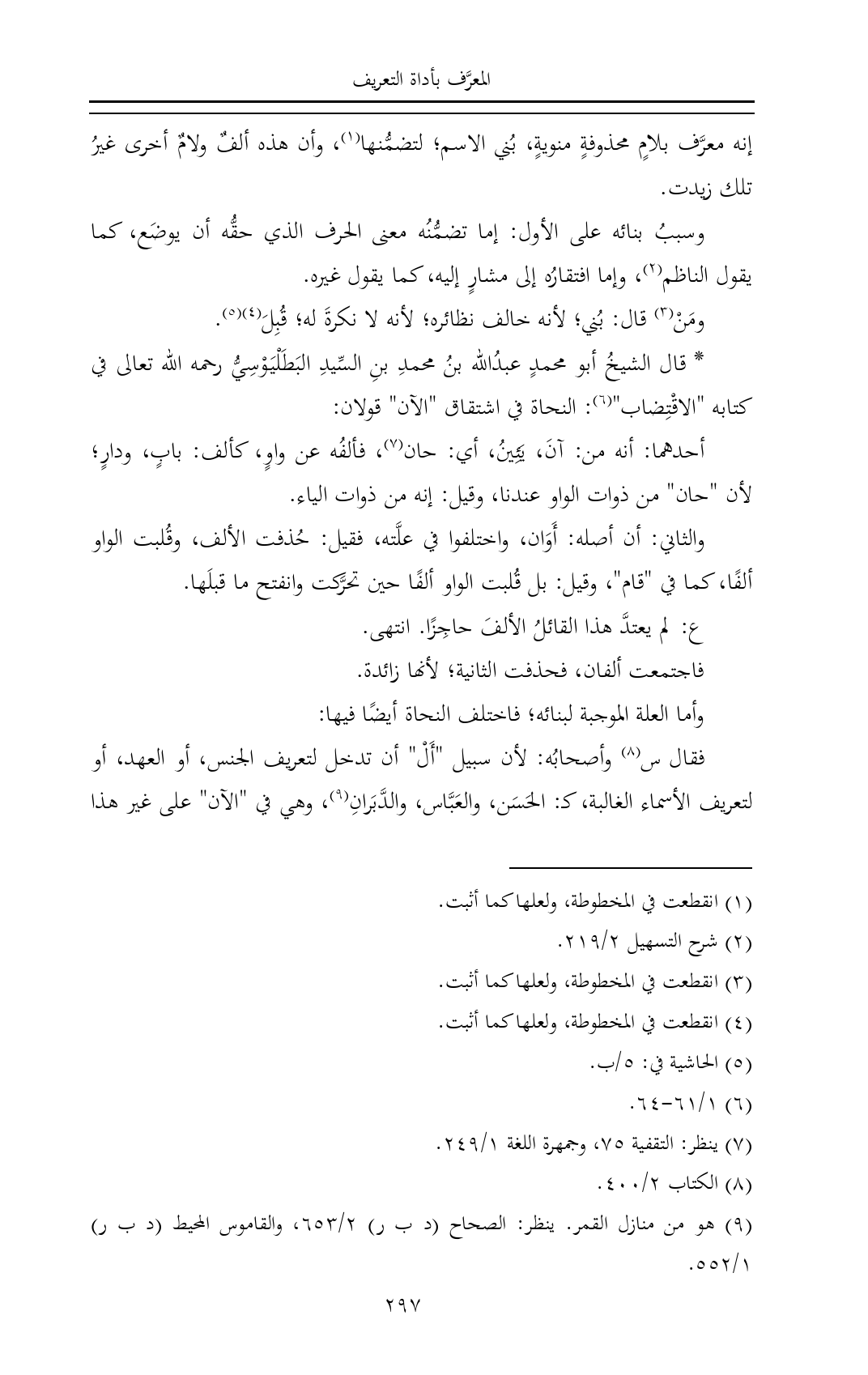 * قال الشيخُ أبو محمدٍ عبدُالله بنُ محمدِ بنِ السِّيدِ البَطَلْيَوْسِيُّ رحمه الله تعالى في كتابه "الاقْتِضاب" (¬٦): النحاة في اشتقاق "الآن" قولان: