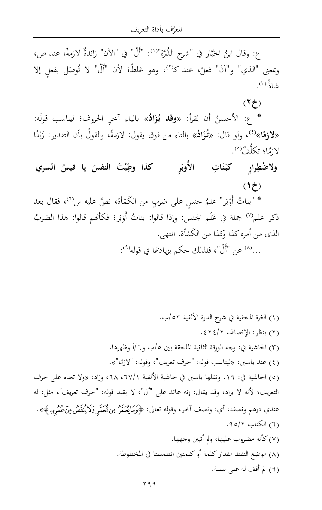 (¬٥) الحاشية في: ١٩. ونقلها ياسين في حاشية الألفية ١/ ٦٧، ٦٨، وزاد: «ولا تعده على حرف التعريف؛ لأنه لا يزاد، وقد يقال: إنه عائد على "أل"، لا بقيد قوله: "حرف تعريف"، مثل: له عندي درهم ونصفه، أي: ونصف آخر، وقوله تعالى: {وَمَا يُعَمَّرُ مِنْ مُعَمَّرٍ وَلَا يُنْقَصُ مِنْ عُمُرِهِ}».