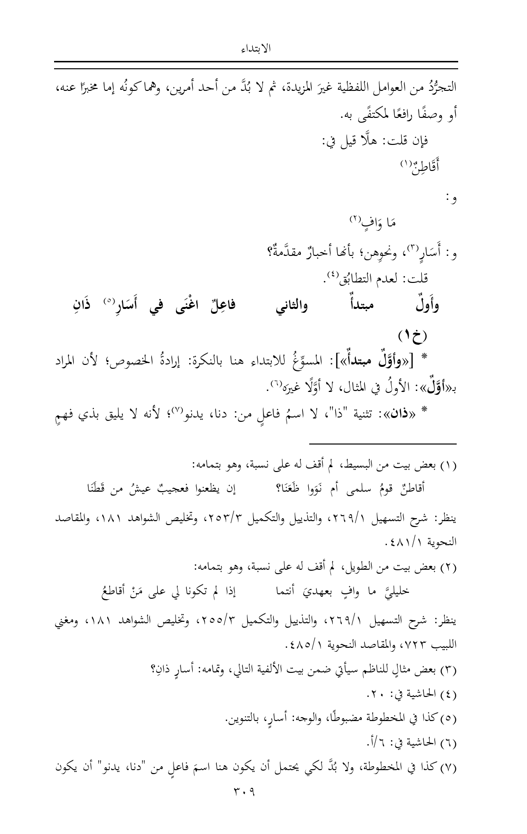 (¬٣) بعض مثالٍ للناظم سيأتي ضمن بيت الألفية التالي، وتمامه: أسارٍ ذانِ؟