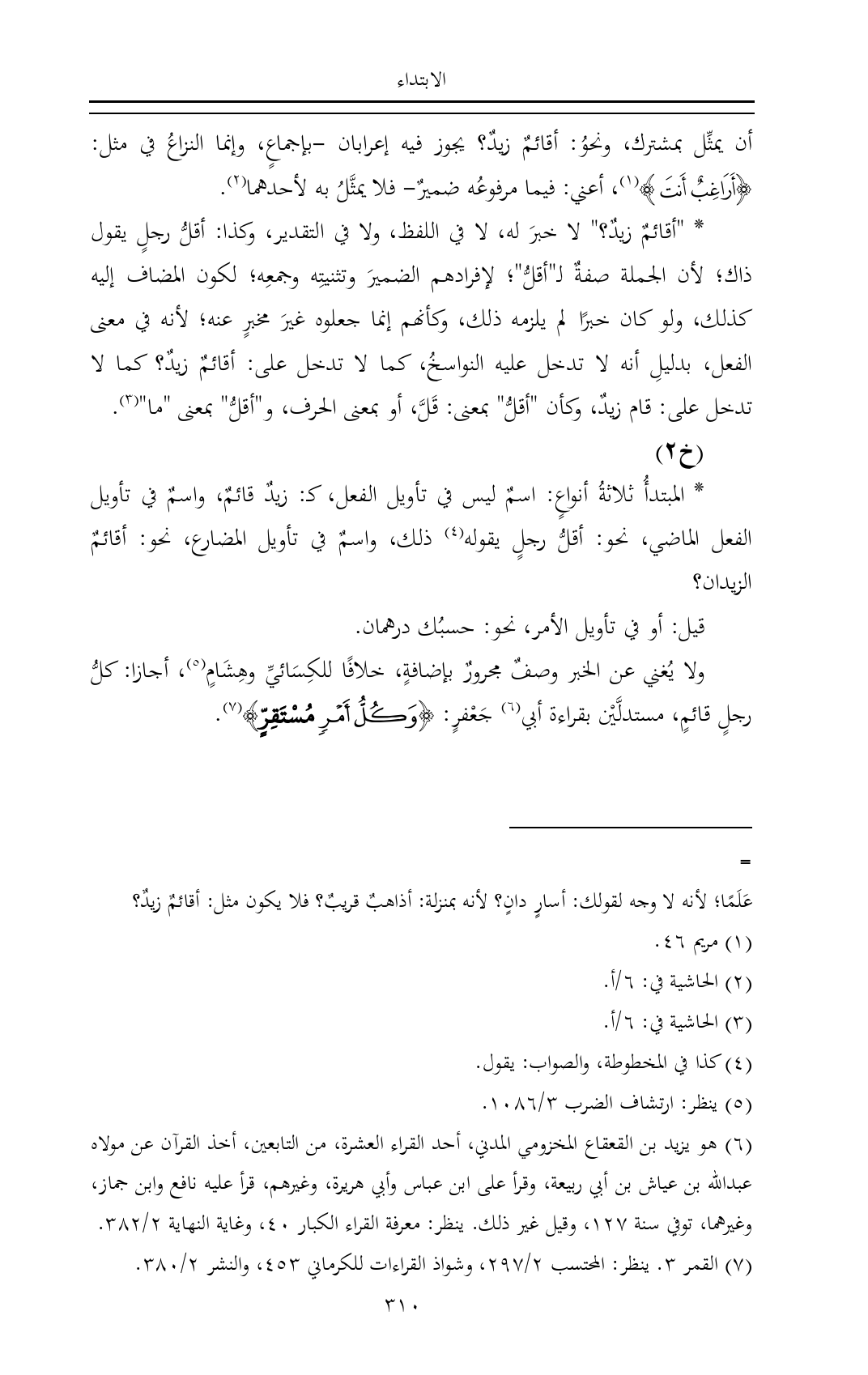 أن يمثِّل بمشترك، ونحوُ: أقائمٌ زيدٌ؟ يجوز فيه إعرابان -بإجماعٍ، وإنما النزاعُ في مثل: {أَرَاغِبٌ أَنْتَ} (¬١)، أعني: فيما مرفوعُه ضميرٌ- فلا يمثَّلُ به لأحدهما (¬٢).