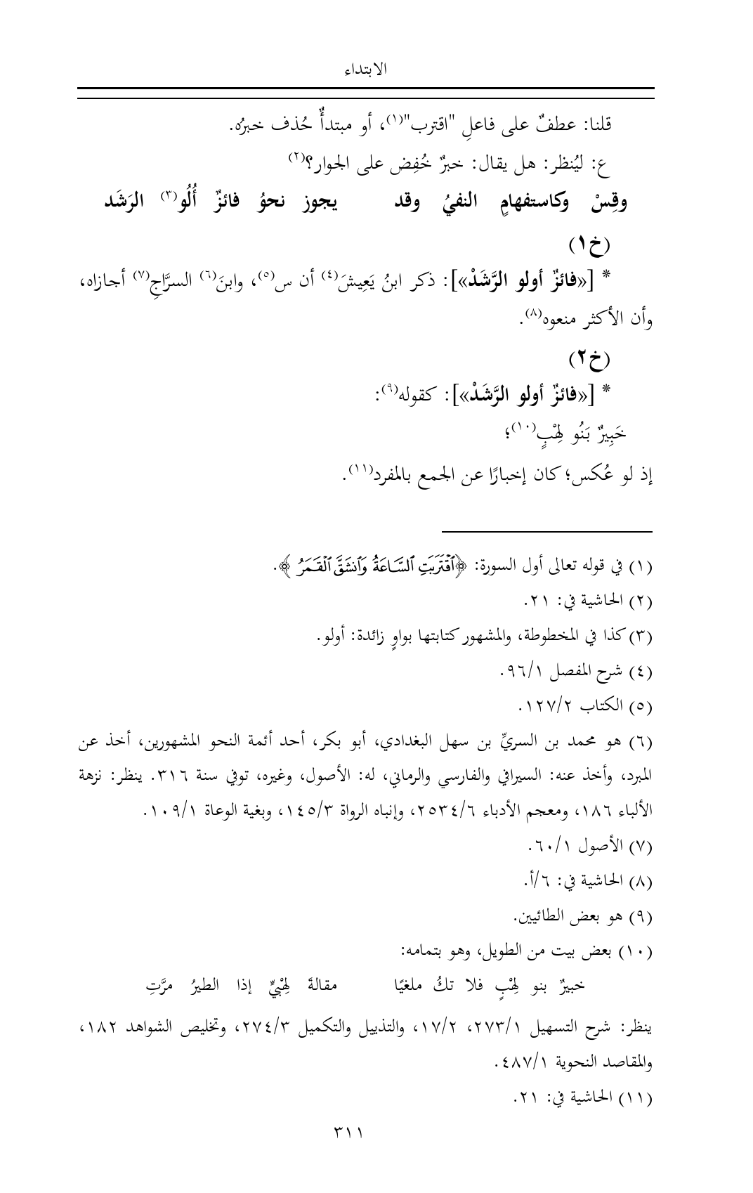 (¬٦) هو محمد بن السريِّ بن سهل البغدادي، أبو بكر، أحد أئمة النحو المشهورين، أخذ عن المبرد، وأخذ عنه: السيرافي والفارسي والرماني، له: الأصول، وغيره، توفي سنة ٣١٦. ينظر: نزهة الألباء ١٨٦، ومعجم الأدباء ٦/ ٢٥٣٤، وإنباه الرواة ٣/ ١٤٥، وبغية الوعاة ١/ ١٠٩.