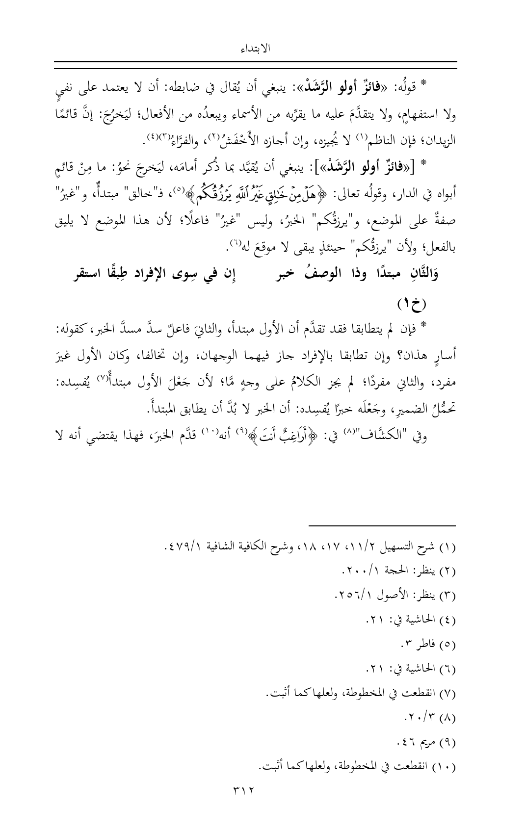 * [«فائزٌ أولو الرَّشَدْ»]: ينبغي أن يُقيَّد بما ذُكر أمامَه، ليَخرجَ نحوُ: ما مِنْ قائمٍ أبواه في الدار، وقولُه تعالى: {هَلْ مِنْ خَالِقٍ غَيْرُ اللَّهِ يَرْزُقُكُمْ} (¬٥)، فـ"خالق" مبتدأٌ، و"غيرُ" صفةٌ على الموضع، و"يرزقُكم" الخبرُ، وليس "غيرُ" فاعلًا؛ لأن هذا الموضع لا يليق بالفعل؛ ولأن "يرزقُكم" حينئذٍ يبقى لا موقعَ له (¬٦).