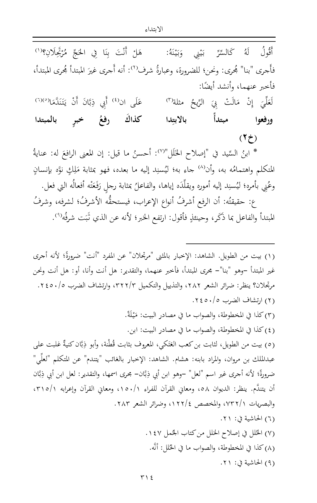 (¬٥) بيت من الطويل، لثابت بن كعب العَتَكي، المعروف بثابت قُطْنة، وأبو ذِبَّان كنيةٌ غلبت على عبدالملك بن مروان، والمراد بابنه: هشام. الشاهد: الإخبار بالغائب "يتندم" عن المتكلم "لعلِّي" ضرورةً؛ لأنه أجرى غير اسم "لعل" -وهو ابن أبي ذِبَّان- مجرى اسمها، والتقدير: لعل ابن أبي ذِبَّان أن يتندَّم. ينظر: الديوان ٥٨، ومعاني القرآن للفراء ١/ ١٥٠، ومعاني القرآن وإعرابه ١/ ٣١٥، والبصريات ١/ ٧٣٢، والمخصص ٤/ ١٢٢، وضرائر الشعر ٢٨٣.