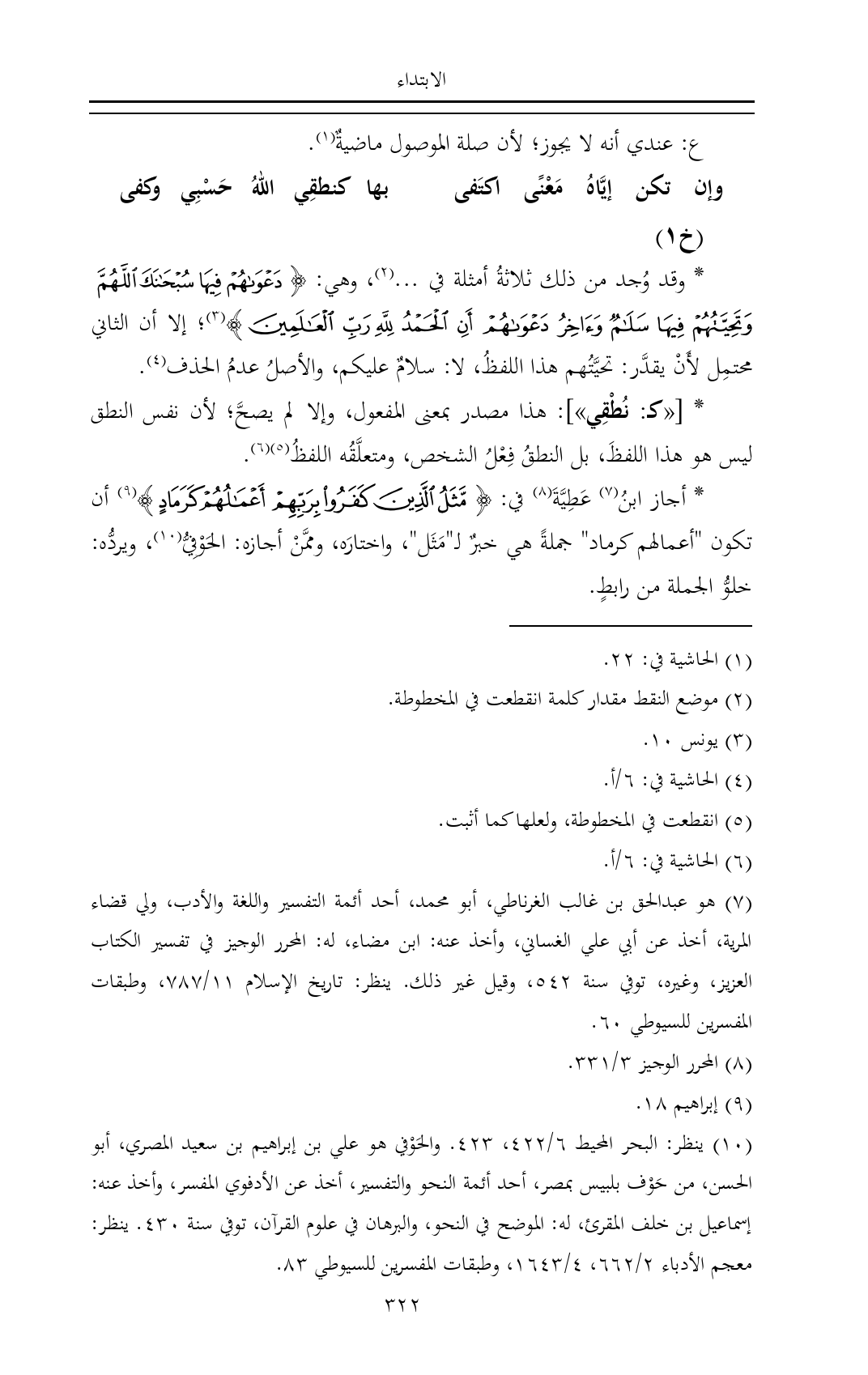 (¬١٠) ينظر: البحر المحيط ٦/ ٤٢٢، ٤٢٣. والحَوْفي هو علي بن إبراهيم بن سعيد المصري، أبو الحسن، من حَوْف بلبيس بمصر، أحد أئمة النحو والتفسير، أخذ عن الأدفوي المفسر، وأخذ عنه: إسماعيل بن خلف المقرئ، له: الموضح في النحو، والبرهان في علوم القرآن، توفي سنة ٤٣٠. ينظر: معجم الأدباء ٢/ ٦٦٢، ٤/ ١٦٤٣، وطبقات المفسرين للسيوطي ٨٣.