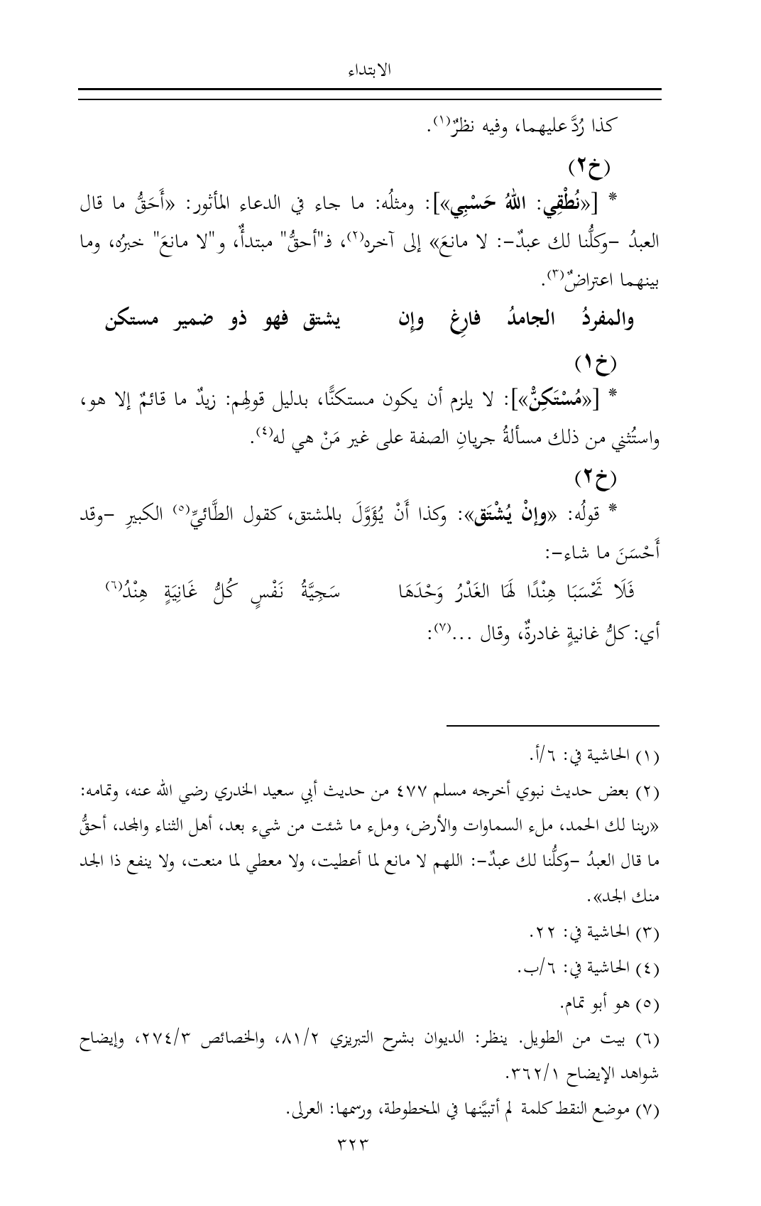 * قولُه: «وإنْ يُشْتَق»: وكذا أَنْ يُؤَوَّلَ بالمشتق، كقول الطَّائيِّ (¬٥) الكبيرِ -وقد أَحْسَنَ ما شاء-: