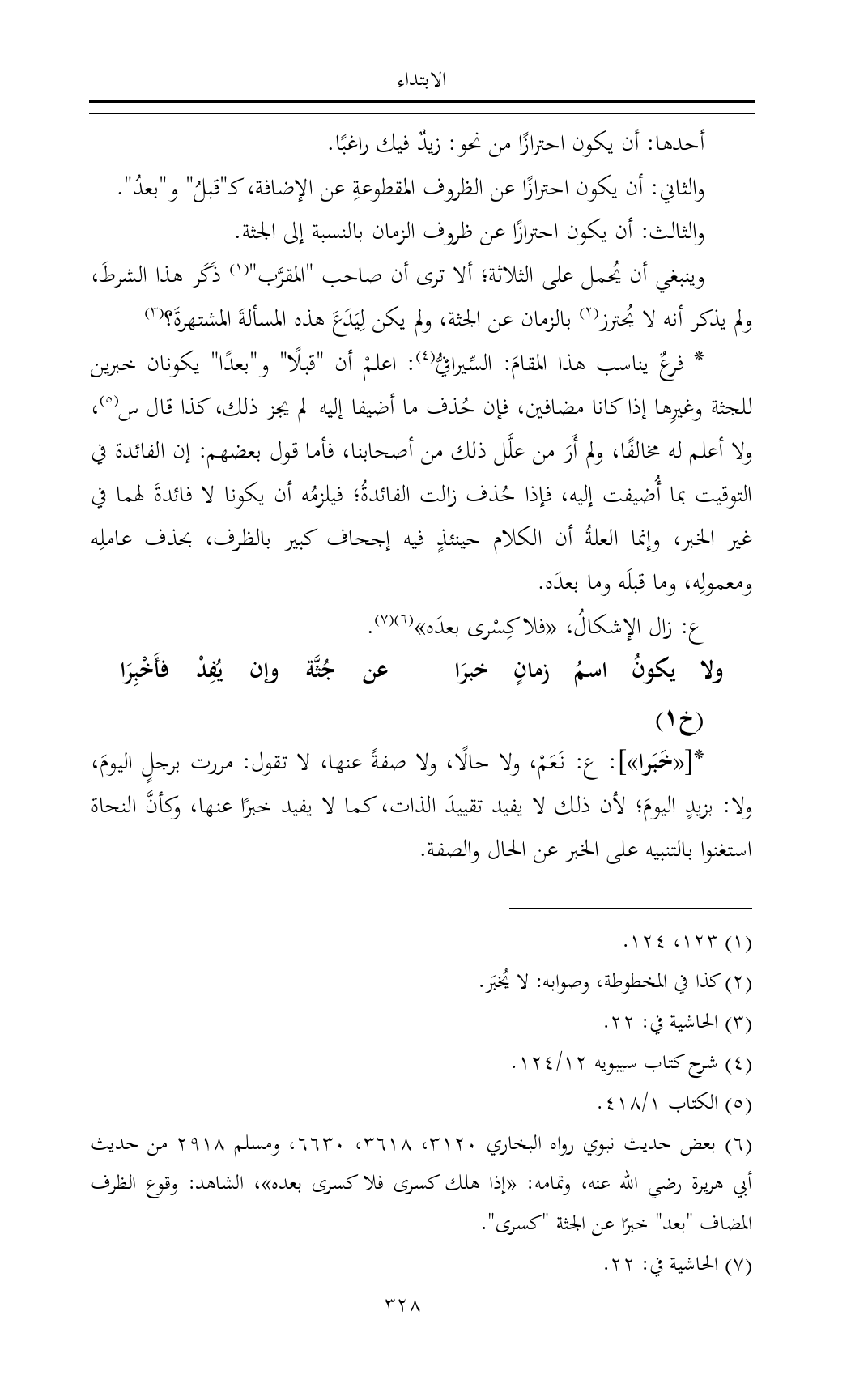 (¬٦) بعض حديث نبوي رواه البخاري ٣١٢٠، ٣٦١٨، ٦٦٣٠، ومسلم ٢٩١٨ من حديث أبي هريرة رضي الله عنه، وتمامه: «إذا هلك كسرى فلا كسرى بعده»، الشاهد: وقوع الظرف المضاف "بعد" خبرًا عن الجثة "كسرى".