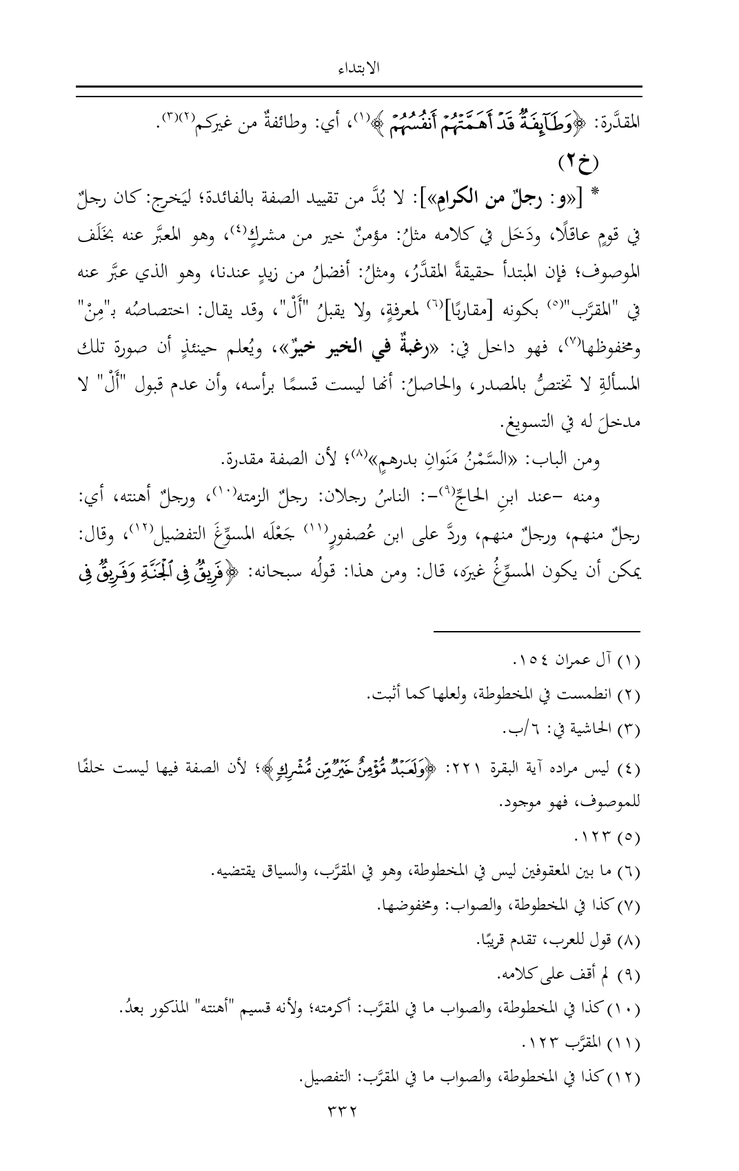 (¬٤) ليس مراده آية البقرة ٢٢١: {وَلَعَبْدٌ مُؤْمِنٌ خَيْرٌ مِنْ مُشْرِكٍ}؛ لأن الصفة فيها ليست خلفًا للموصوف، فهو موجود.