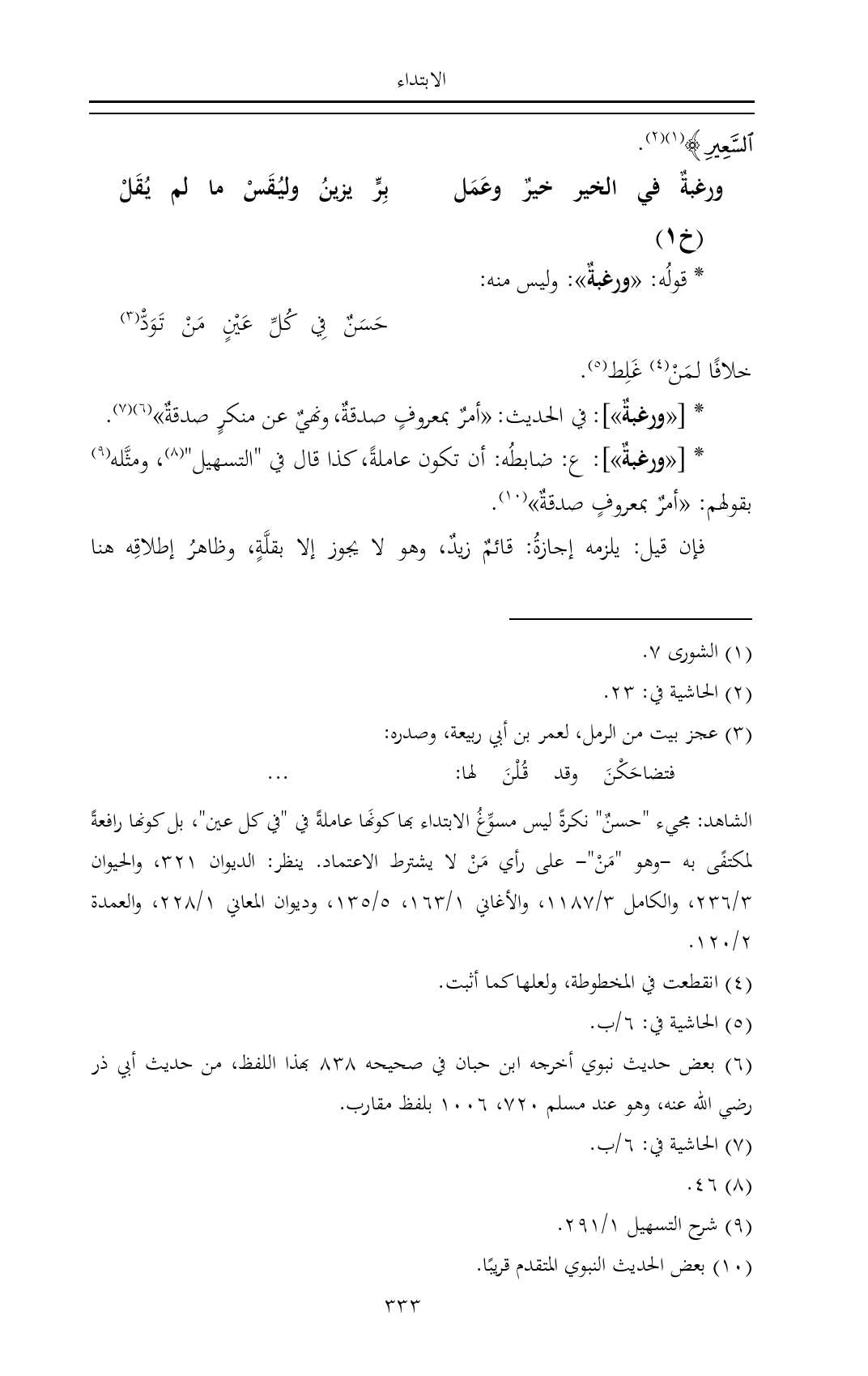 الشاهد: مجيء "حسنٌ" نكرةً ليس مسوِّغُ الابتداء بها كونَها عاملةً في "في كل عين"، بل كونها رافعةً لمكتفًى به -وهو "مَنْ"- على رأي مَنْ لا يشترط الاعتماد. ينظر: الديوان ٣٢١، والحيوان ٣/ ٢٣٦، والكامل ٣/ ١١٨٧، والأغاني ١/ ١٦٣، ٥/ ١٣٥، وديوان المعاني ١/ ٢٢٨، والعمدة ٢/ ١٢٠.