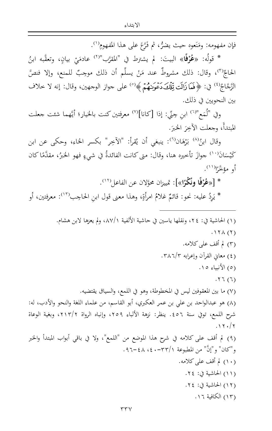 (¬٩) لم أقف على كلامه في شرح هذا الموضع من "اللمع"، ولا في باقي أبواب المبتدأ والخبر و"كان" و"إنَّ" من المطبوعة ١/ ٣٣ - ٤٠، ٤٨ - ٩٦.