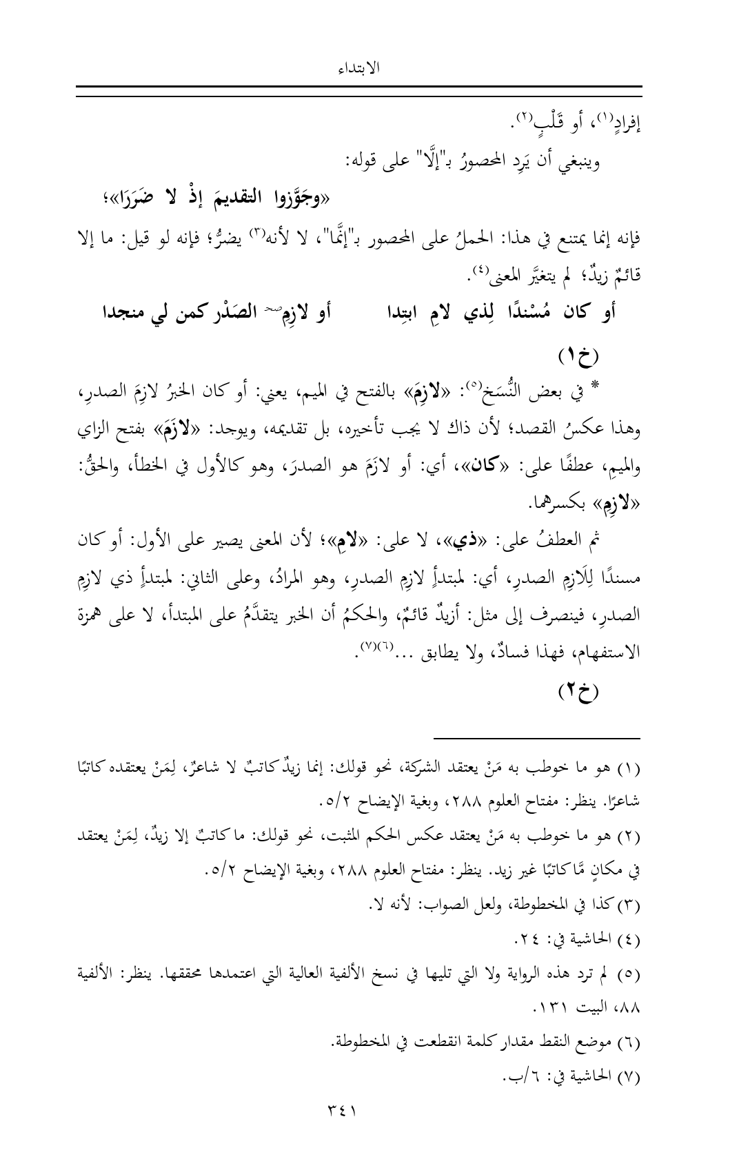 * في بعض النُّسَخ (¬٥): «لازِمَ» بالفتح في الميم، يعني: أو كان الخبرُ لازِمَ الصدرِ، وهذا عكسُ القصد؛ لأن ذاك لا يجب تأخيره، بل تقديمه، ويوجد: «لازَمَ» بفتح الزاي والميمِ، عطفًا على: «كان»، أي: أو لازَمَ هو الصدرَ، وهو كالأول في الخطأ، والحقُّ: «لازِمِ» بكسرهما.