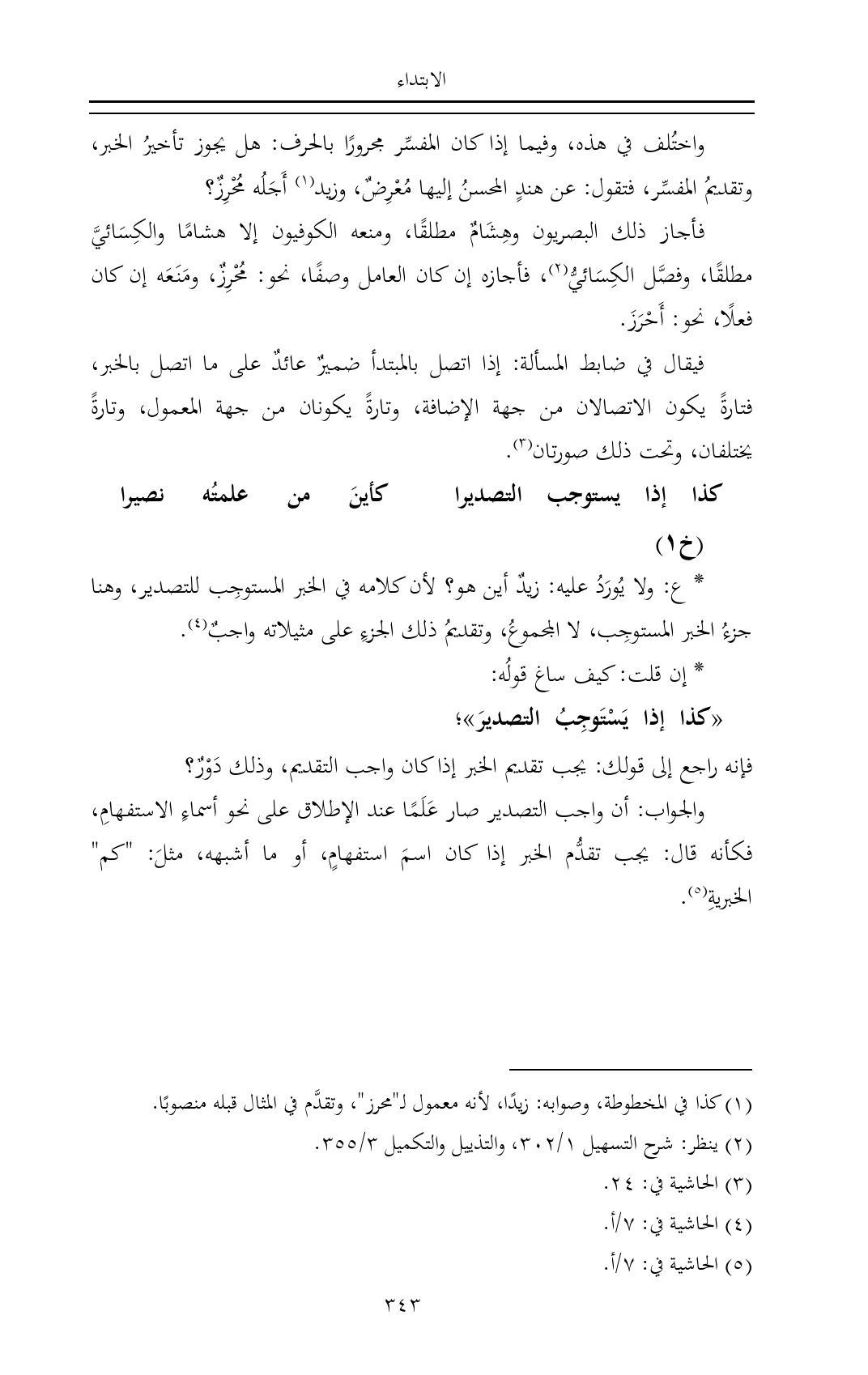 * ع: ولا يُورَدُ عليه: زيدٌ أين هو؟ لأن كلامه في الخبر المستوجِب للتصدير، وهنا جزءُ الخبر المستوجِب، لا المجموعُ، وتقديمُ ذلك الجزءِ على مثيلاته واجبٌ (¬٤).