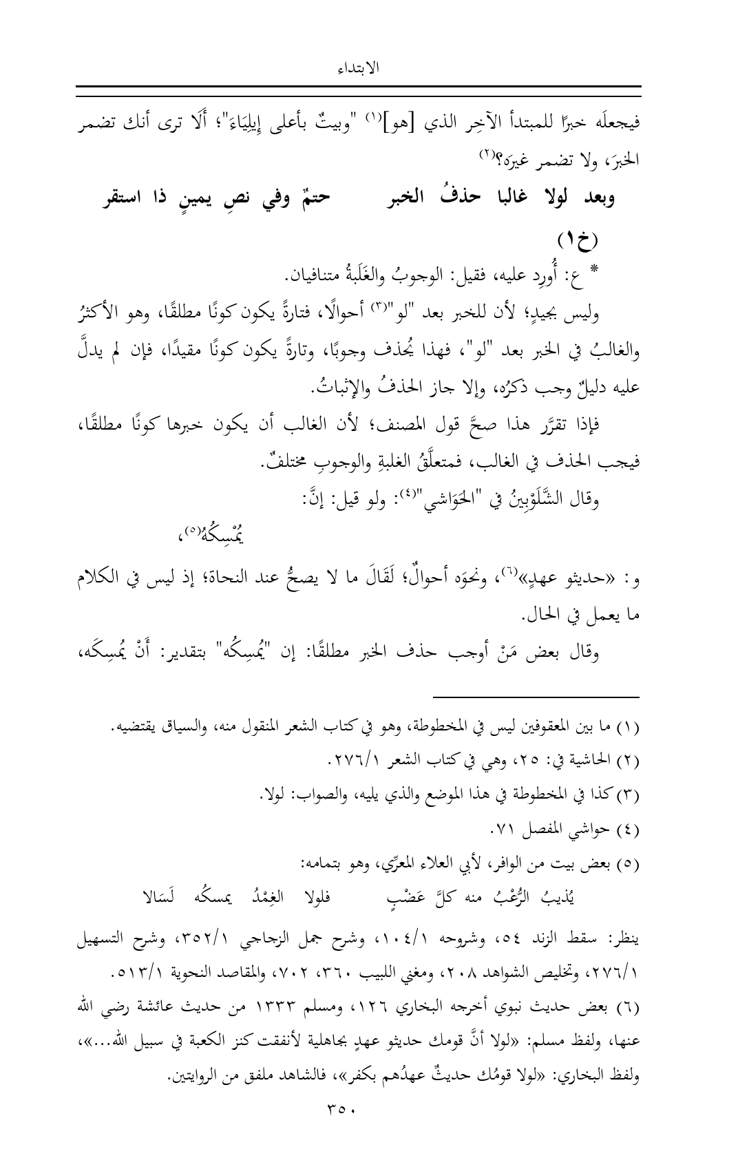 وليس بجيدٍ؛ لأن للخبر بعد "لو" (¬٣) أحوالًا، فتارةً يكون كونًا مطلقًا، وهو الأكثرُ والغالبُ في الخبر بعد "لو"، فهذا يُحذف وجوبًا، وتارةً يكون كونًا مقيدًا، فإن لم يدلَّ عليه دليلٌ وجب ذكرُه، وإلا جاز الحذفُ والإثباتُ.