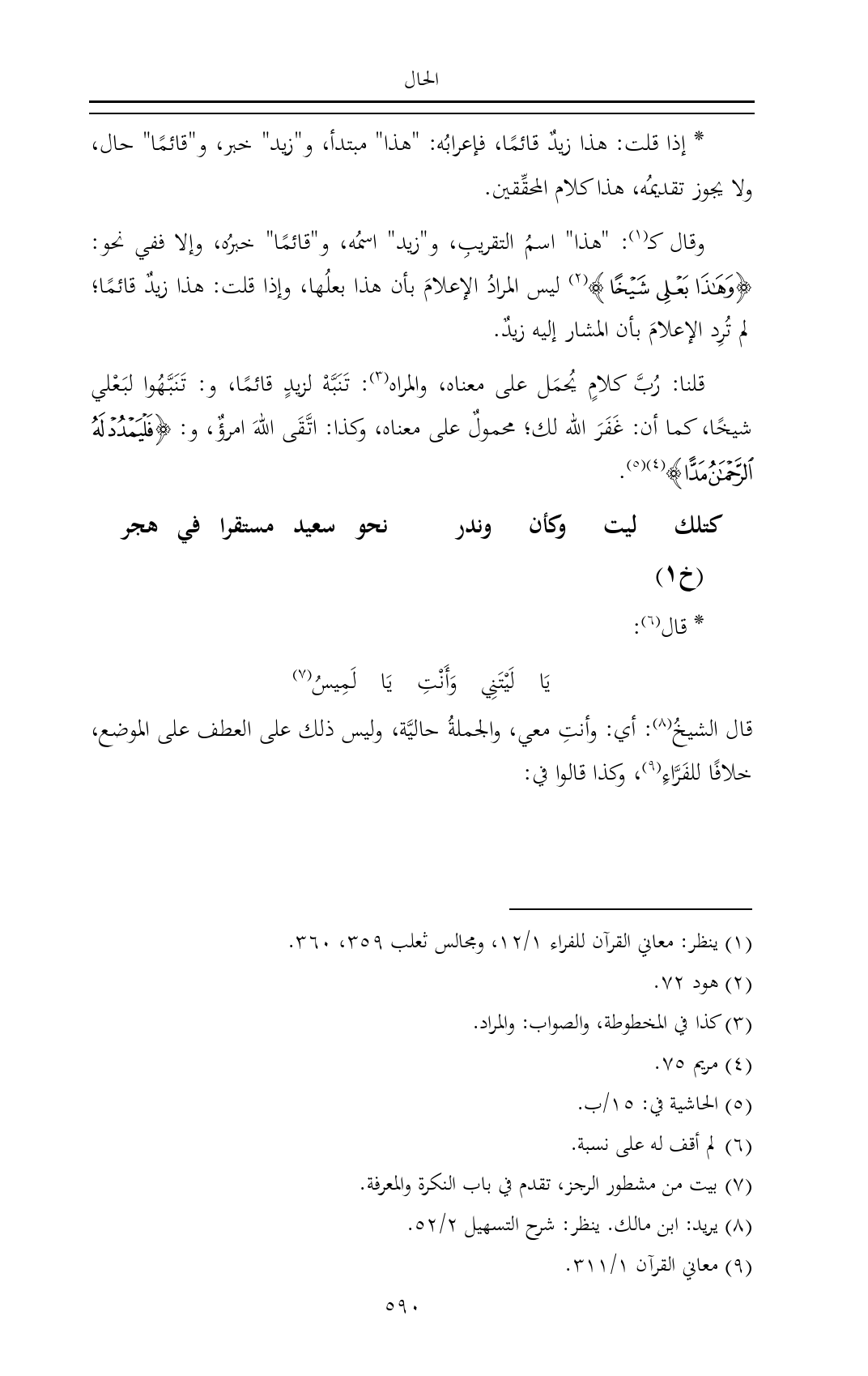 وقال كـ (¬١): "هذا" اسمُ التقريبِ، و"زيد" اسمُه، و"قائمًا" خبرُه، وإلا ففي نحو: {وَهَذَا بَعْلِي شَيْخًا} (¬٢) ليس المرادُ الإعلامَ بأن هذا بعلُها، وإذا قلت: هذا زيدٌ قائمًا؛ لم تُرِد الإعلامَ بأن المشار إليه زيدٌ.