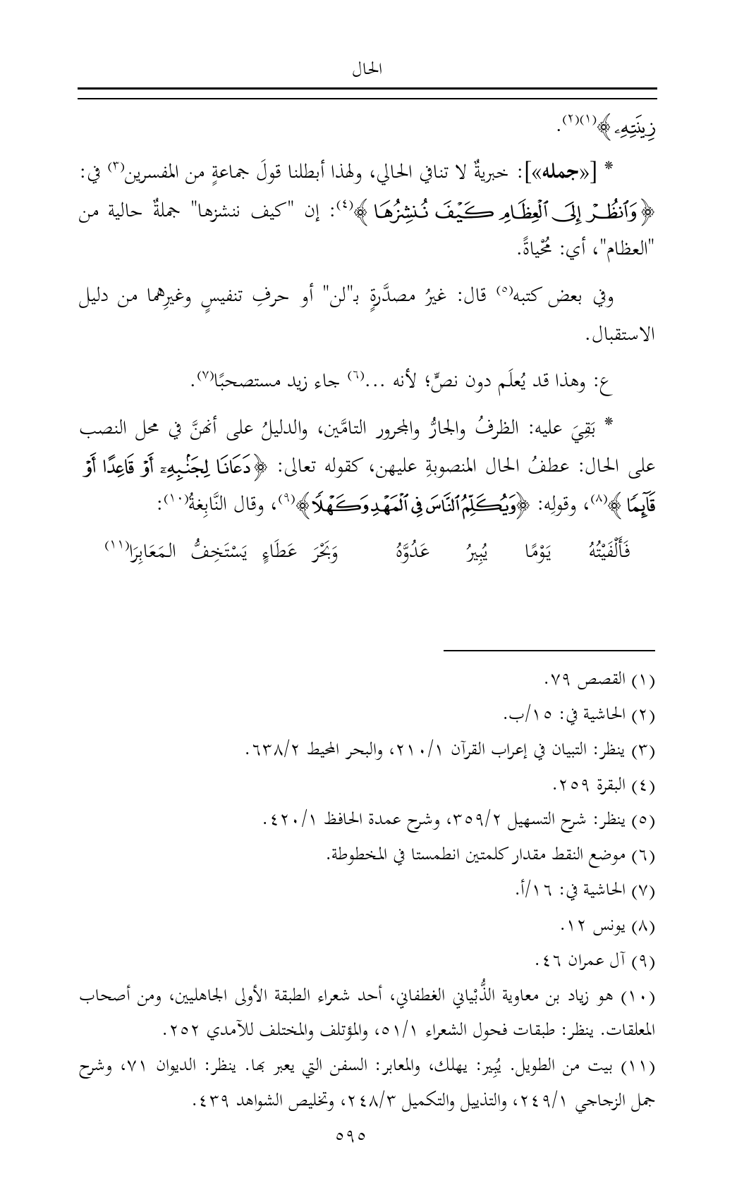 * [«جمله»]: خبريةٌ لا تنافي الحالي، ولهذا أبطلنا قولَ جماعةٍ من المفسرين (¬٣) في: {وَانْظُرْ إِلَى الْعِظَامِ كَيْفَ نُنْشِزُهَا} (¬٤): إن "كيف ننشزها" جملةٌ حالية من "العظام"، أي: مُحْياةً.