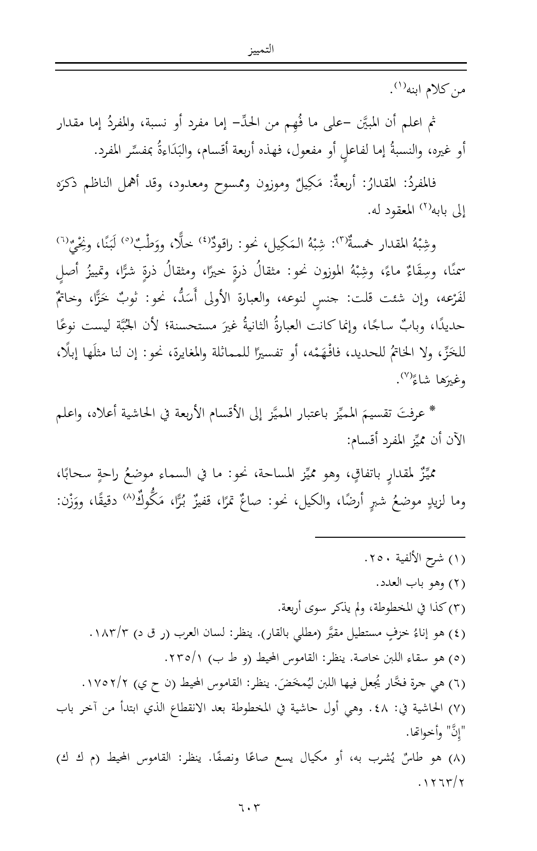 * عرفتَ تقسيمَ المميِّز باعتبار المميَّز إلى الأقسام الأربعة في الحاشية أعلاه، واعلم الآن أن مميِّز المفرد أقسام: