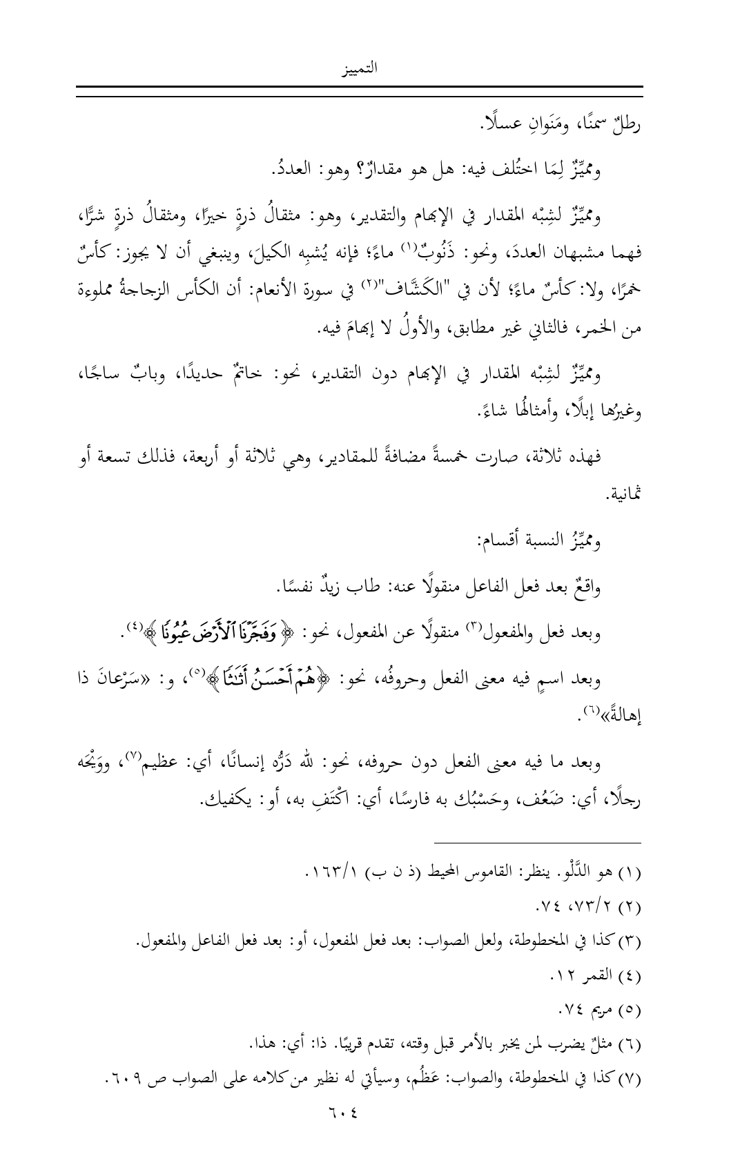 ومميِّزٌ لشِبْه المقدار في الإبهام والتقدير، وهو: مثقالُ ذرةٍ خيرًا، ومثقالُ ذرةٍ شرًّا، فهما مشبهان العددَ، ونحو: ذَنُوبٌ (¬١) ماءً؛ فإنه يُشبِه الكيلَ، وينبغي أن لا يجوز: كأسٌ خمرًا، ولا: كأسٌ ماءً؛ لأن في "الكَشَّاف" (¬٢) في سورة الأنعام: أن الكأس الزجاجةُ مملوءة من الخمر، فالثاني غير مطابق، والأولُ لا إبهامَ فيه.